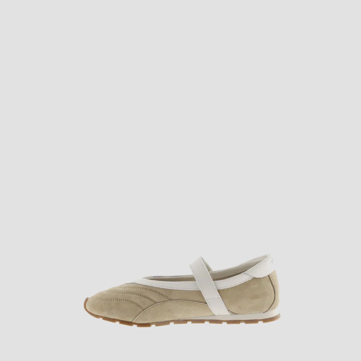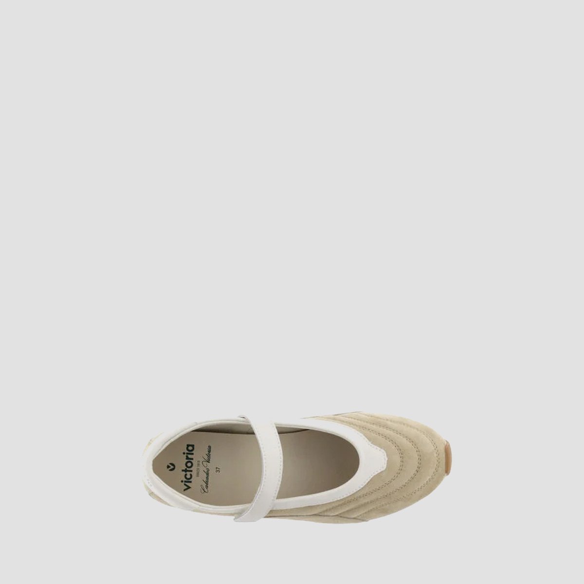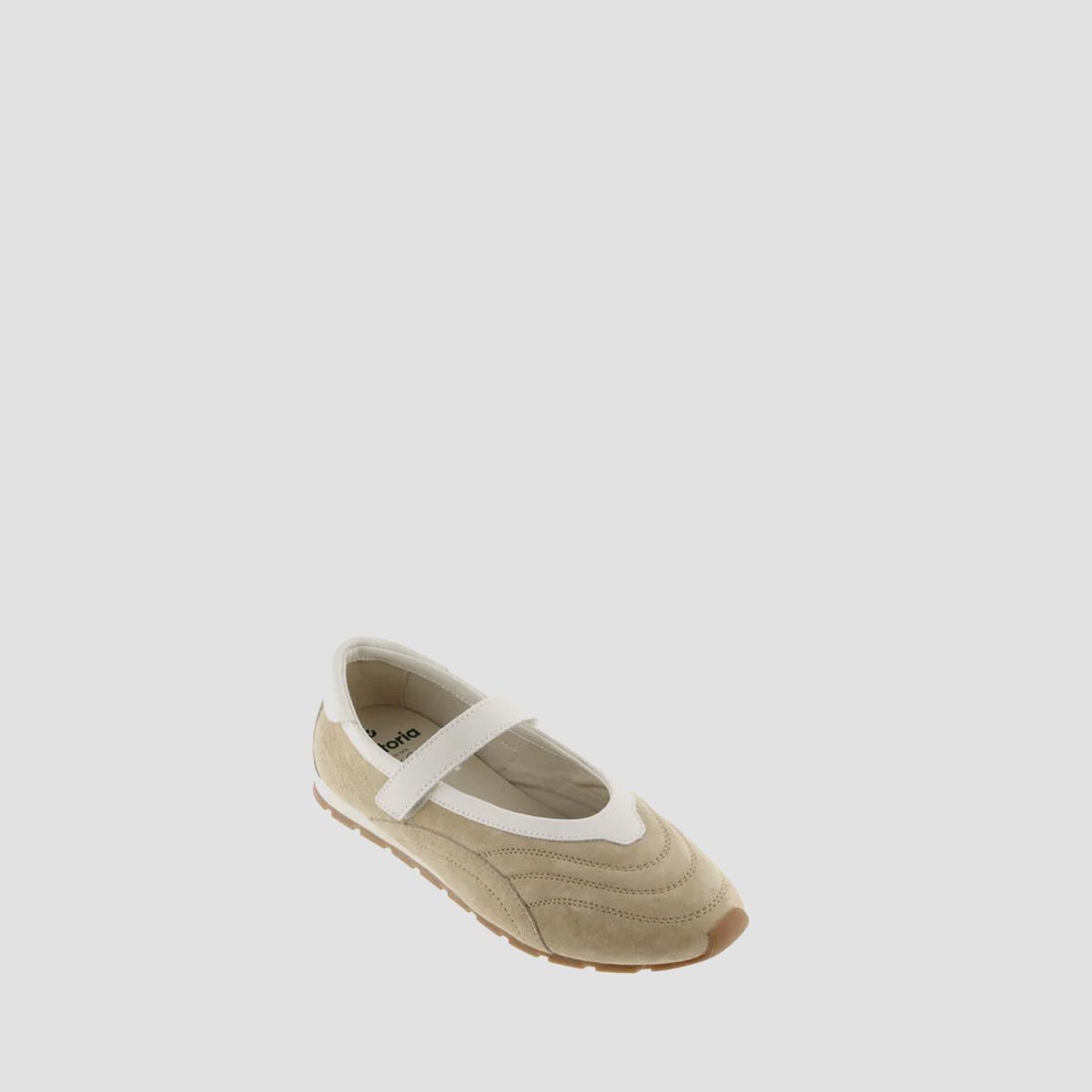 Women’s mary jane shoes made from suede. Visible stitching. White hook-and-loop strap fastening matching the trim. Embossed brand logo on the heel panel. Rubber sole with caramel-coloured serrated EVA tread