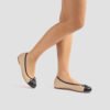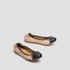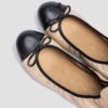 Flat round toe ballerina shoe made in leather. Contrasting black leather toe. Stretch edging and a matching tone leather bow. Removable padded insole. Non-slip, flexible and non-slip rubber sole. A comfortable and practical design for every day wear