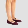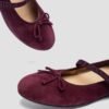 Flat round toe ballerina shoe. Made in suede. Stretch binding and elastic strap over the vamp. Matching bow trim. Light, flexible, non-slip rubber sole. With a removable padded insole that reduces fatigue when walking. Beautiful and comfortable all day long.
