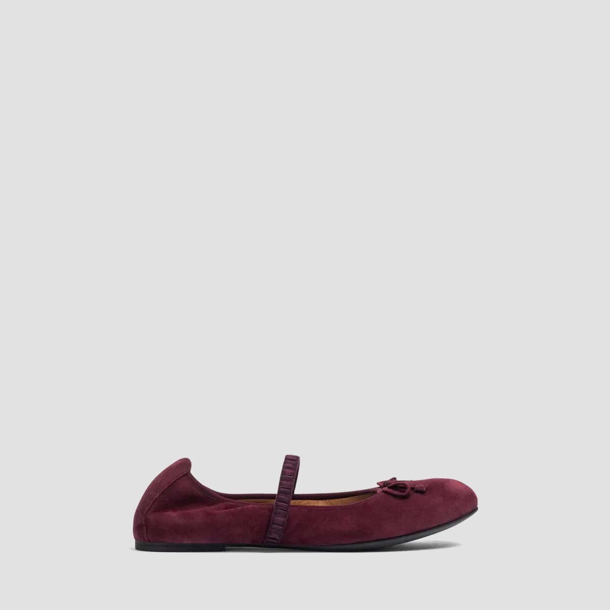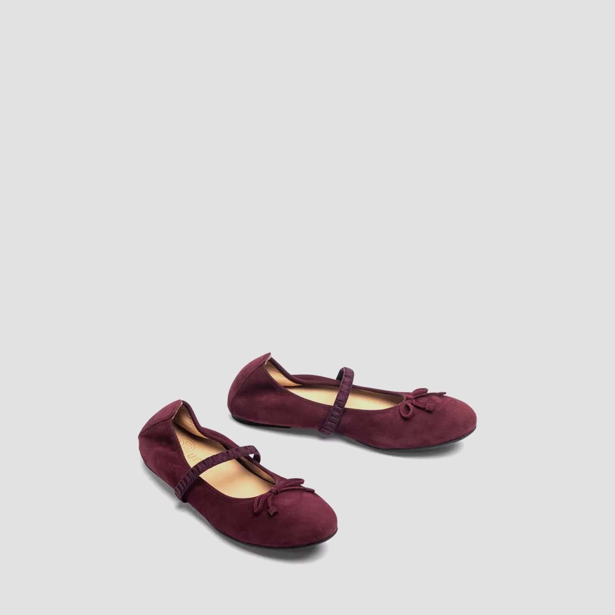 Flat round toe ballerina shoe. Made in suede. Stretch binding and elastic strap over the vamp. Matching bow trim. Light, flexible, non-slip rubber sole. With a removable padded insole that reduces fatigue when walking. Beautiful and comfortable all day long.