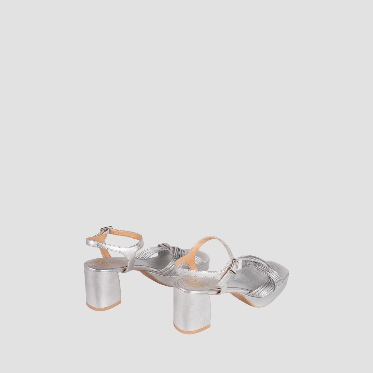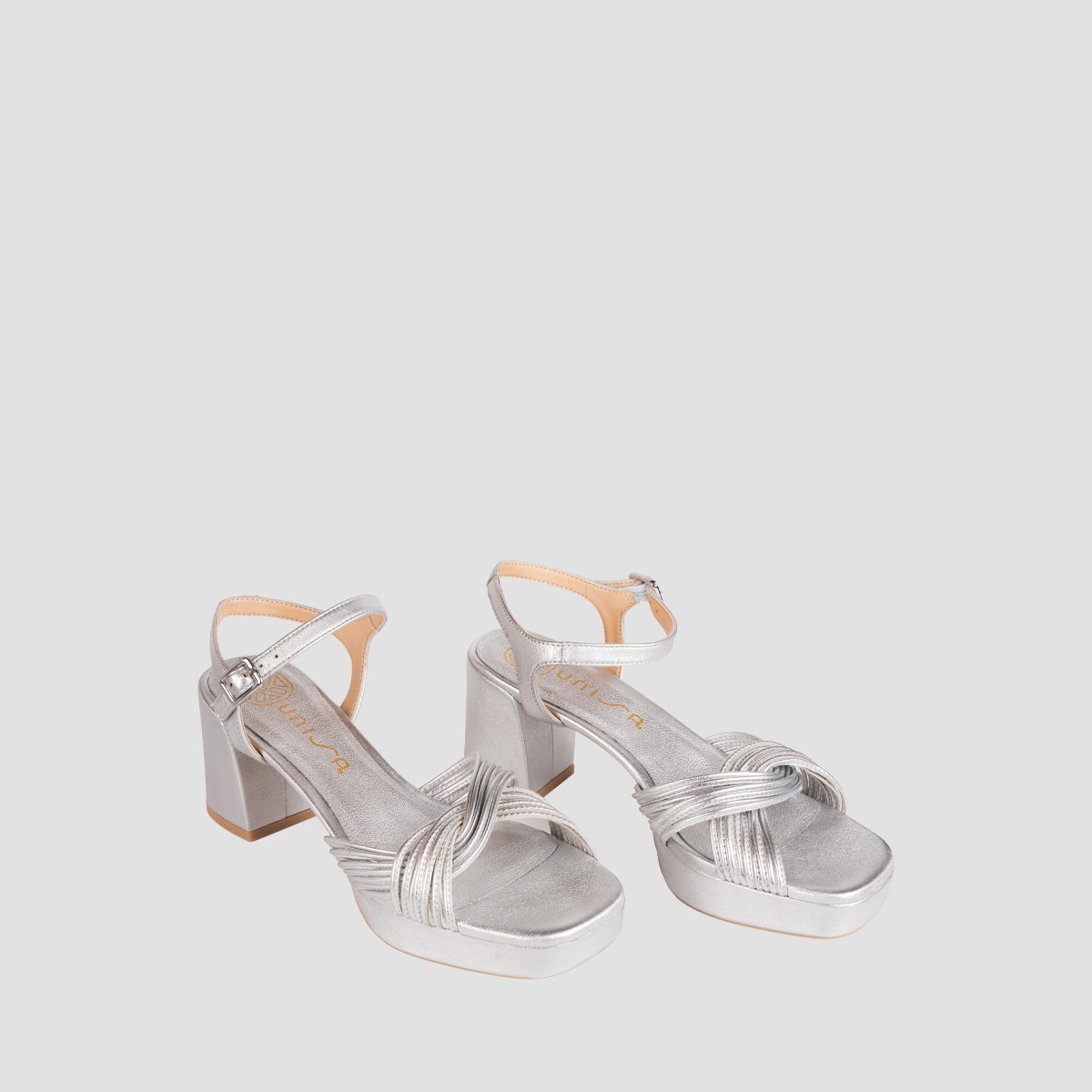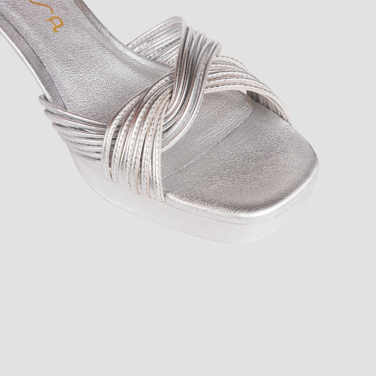 Square toe sandal made in metallic leather. Thin metallic leather straps on the front. 2.5cm platform and a 7cm heel in a matching tone. Ankle strap that can be adjusted with a metal buckle. Non-slip rubber sole.