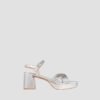 Square toe sandal made in metallic leather. Thin metallic leather straps on the front. 2.5cm platform and a 7cm heel in a matching tone. Ankle strap that can be adjusted with a metal buckle. Non-slip rubber sole.