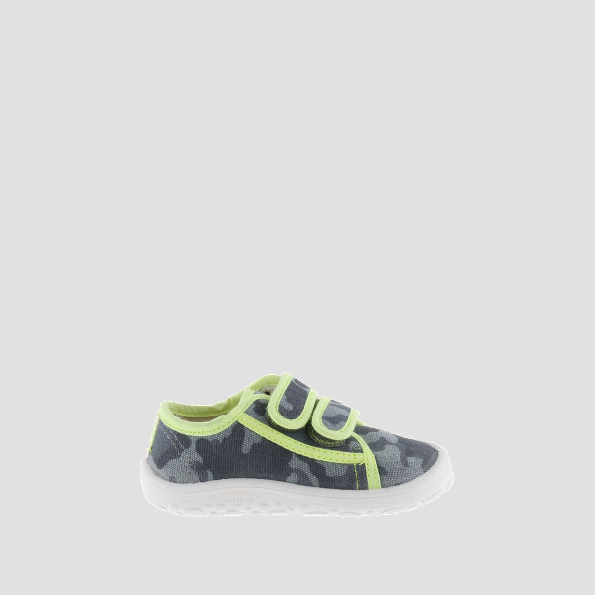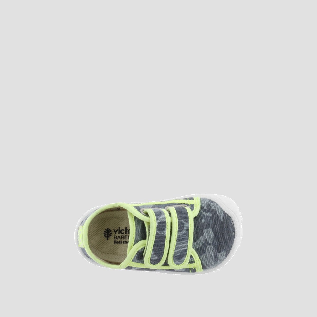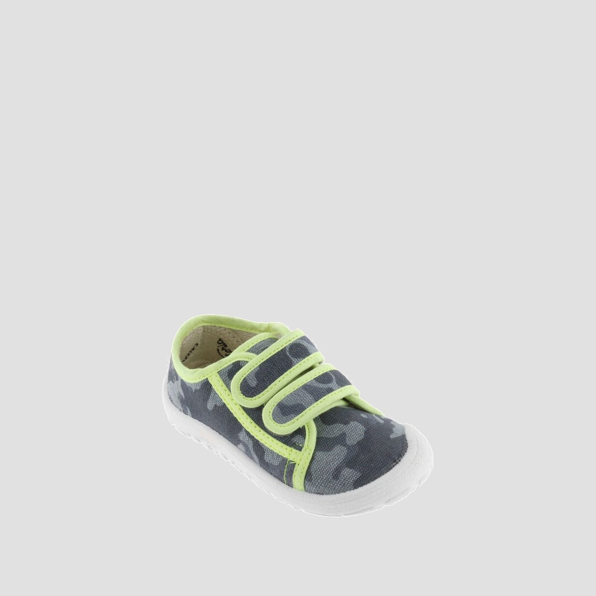 Kids’ Barefoot trainers with camouflage print and contrasting trim. Fastened with two adhesive straps for easy wear. Flexible, with no reinforcements, a wide fit, and lightweight, which allow free foot movement without deforming it. Their removable, washable insole, flat non-slip sole, and toe freedom ensure comfort, safety, and balance. Eco-friendly footwear that supports the natural development of young children’s feet.