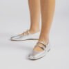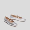 Flat square toe T-bar ballerina shoe. Made in metallic finish leather. Double strap with a buckle on the instep. Non-slip, flexible and light rubber sole. A comfortable and practical design for every day wear