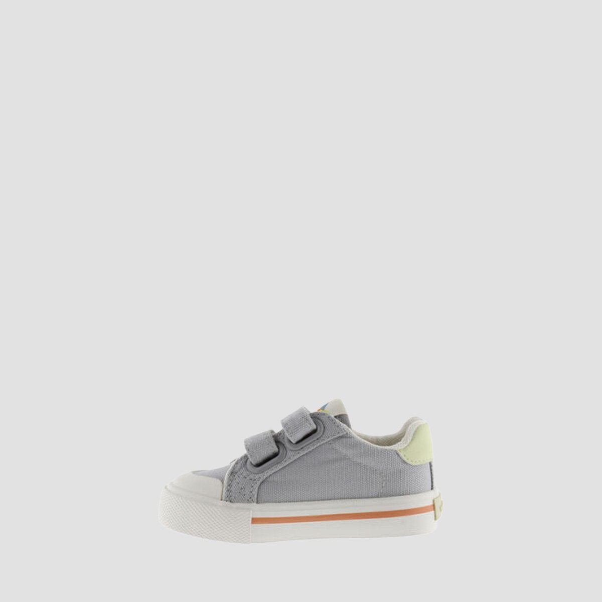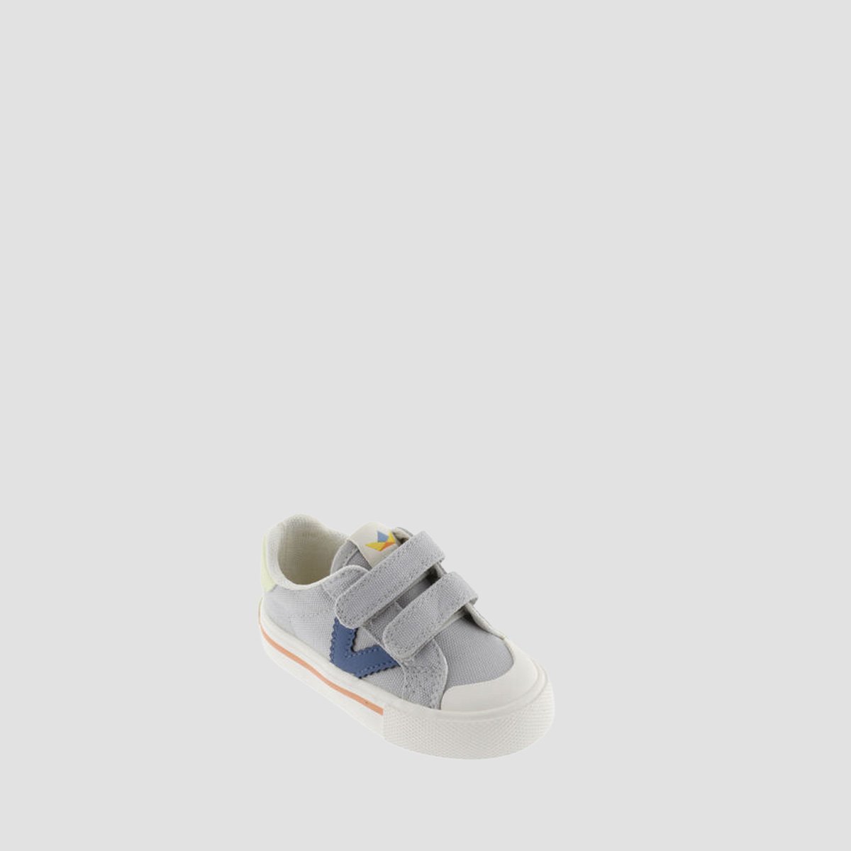Canvas trainers for kids. Contrasting side victoria “V” and back panel. Printed design label on the tongue. Double hook-and-loop straps for better support and greater independence when putting them on. Rubber sole with reinforced toe cap for extra strength and durability.