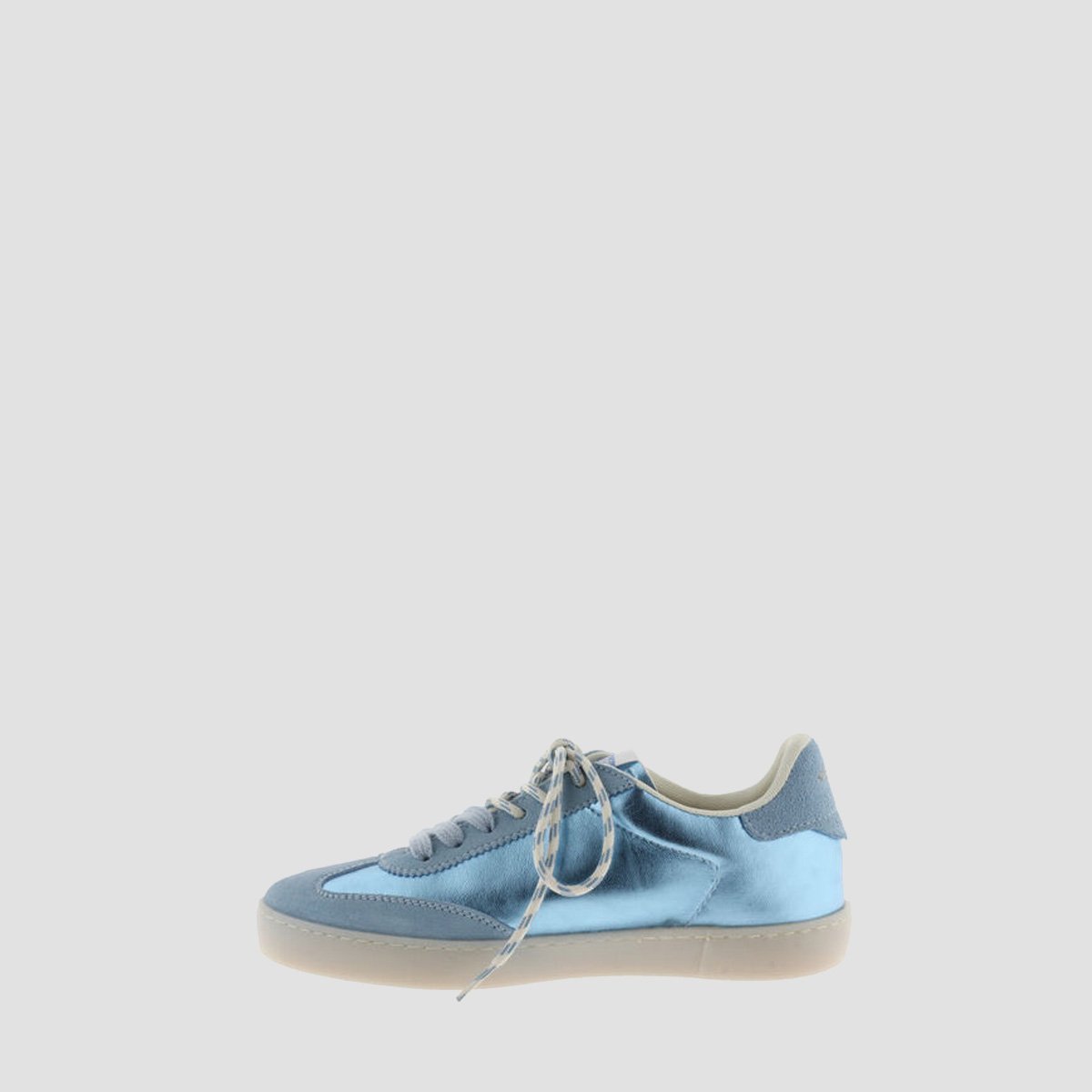Women’s trainers made in Spain from metallic-effect faux leather with matching suede overlay panels. Contrasting white side victoria “V”. Double lace-up fastening: one white pair and one round pair with matching print.