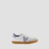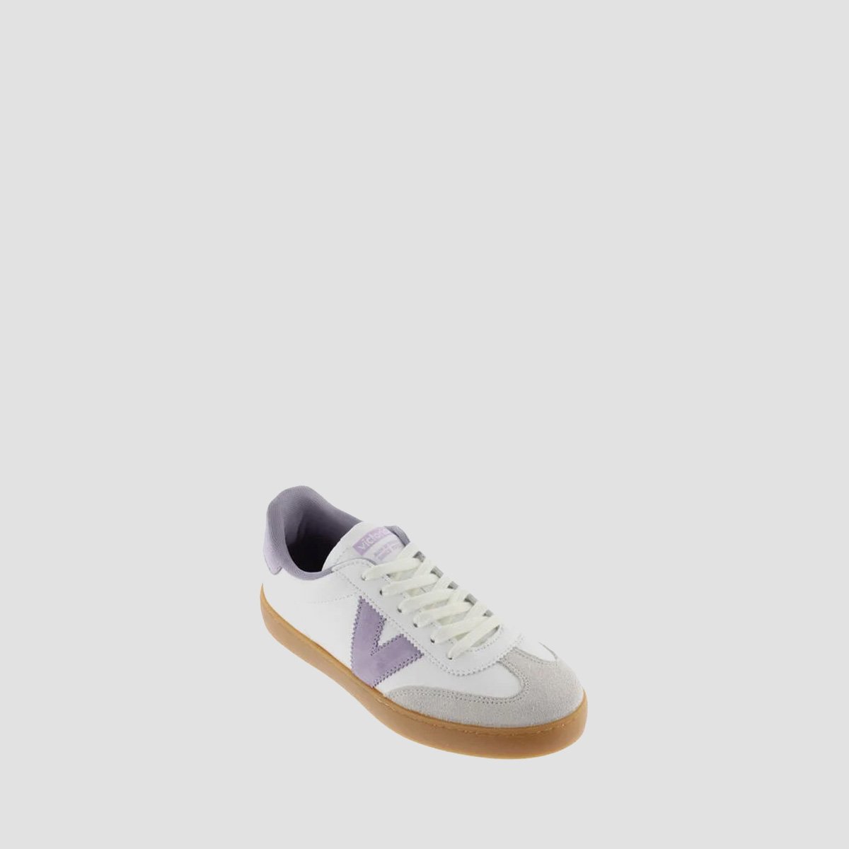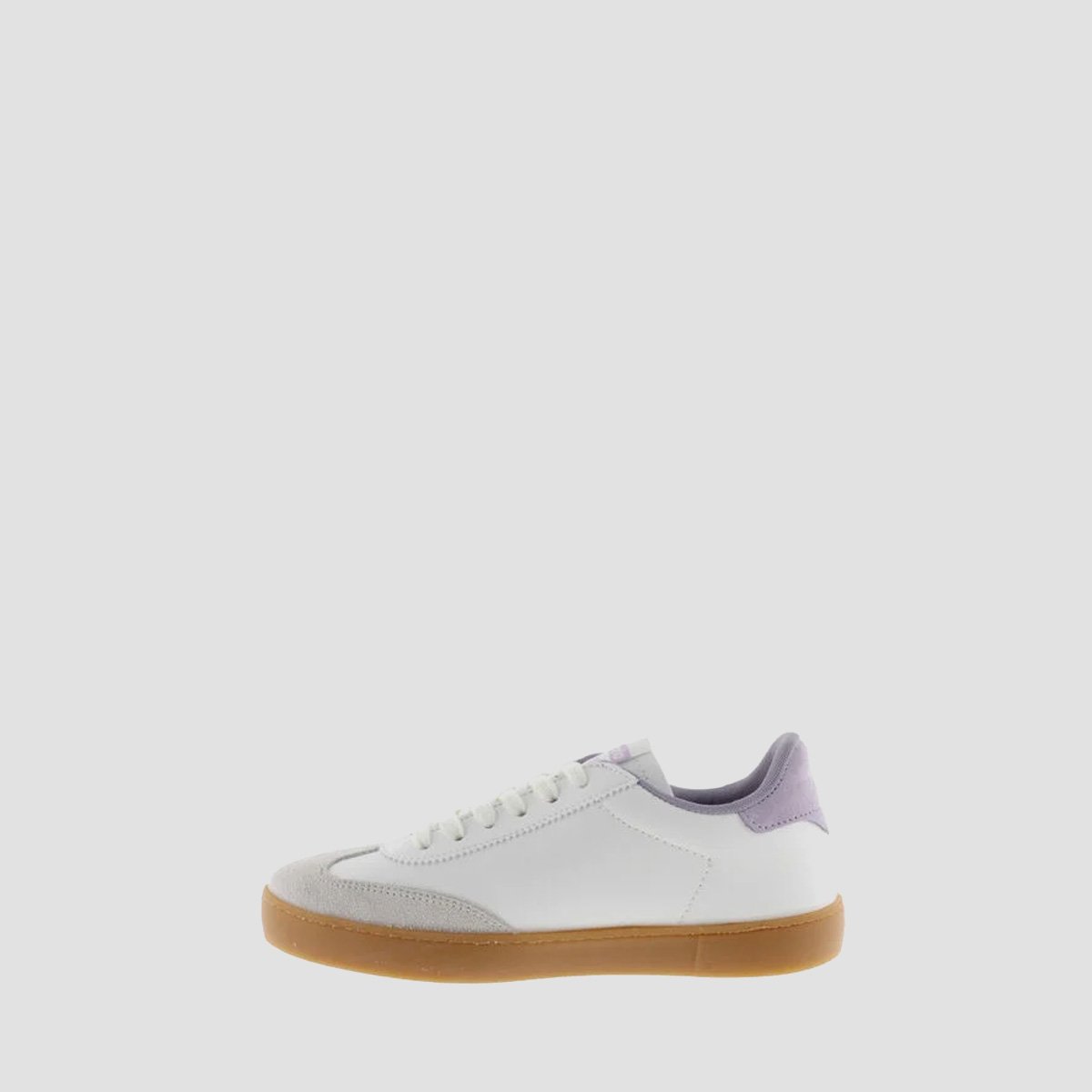 Women’s trainers made in Spain from white faux leather with suede panels. Side victoria “V”, lining and heel panel in matching contrasting colours. Translucent caramel-coloured sole