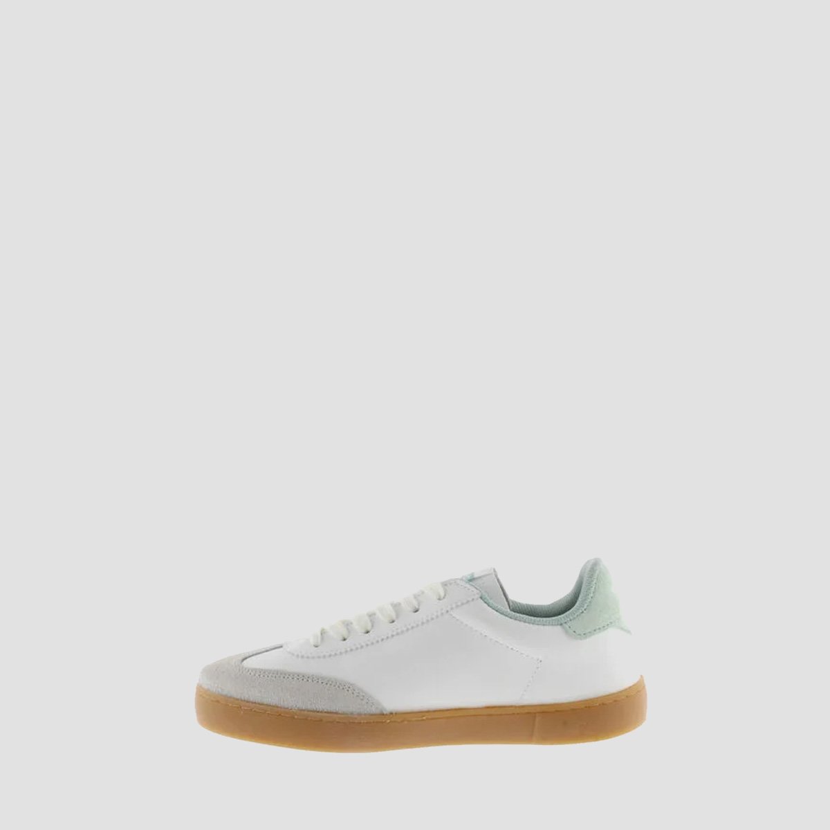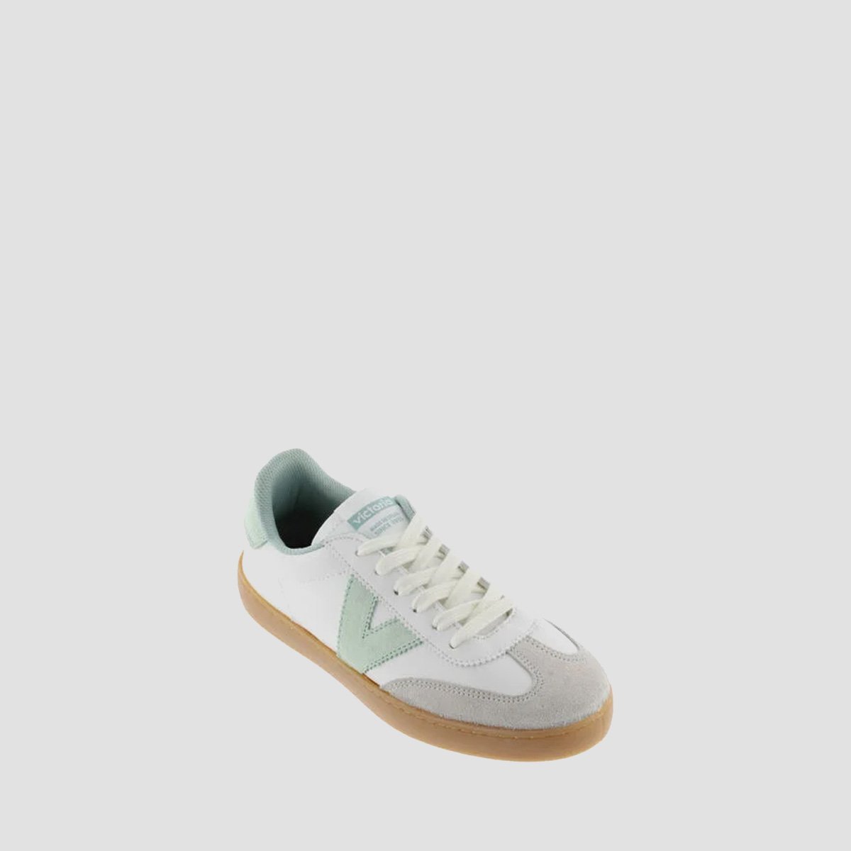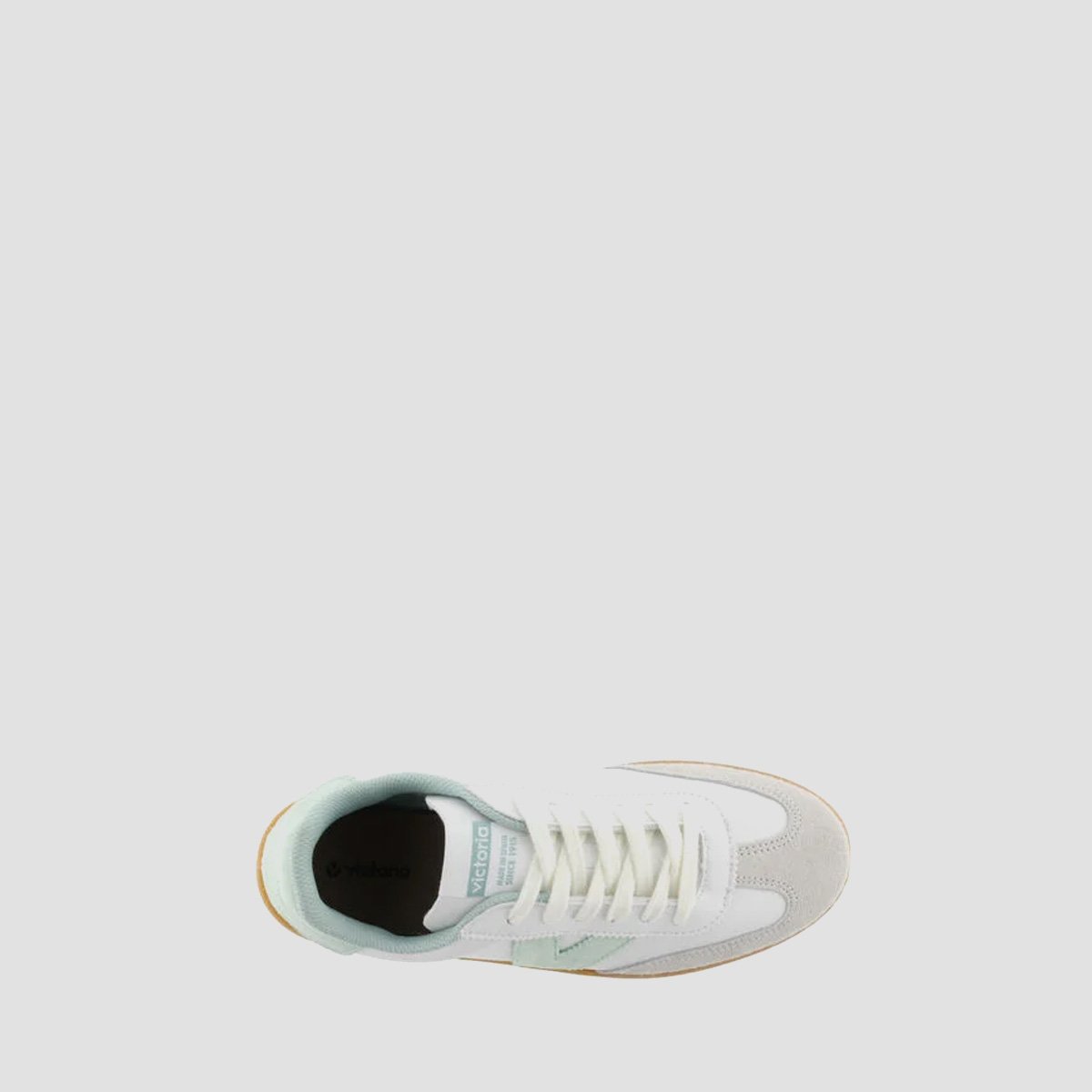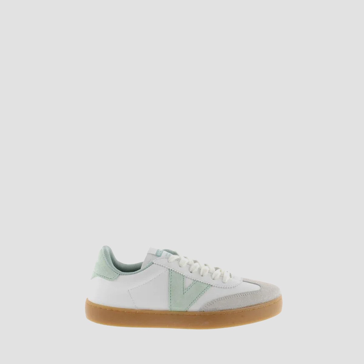 Women’s trainers made in Spain from white faux leather with suede panels. Side victoria “V”, lining and heel panel in matching contrasting colours. Translucent caramel-coloured sole