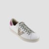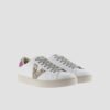 Women’s white trainers made using leather of the highest quality. They have the LWG (Leather Working Group) silver distinction, which guarantees a responsible tanning process, with an efficient use of water, energy and sustainable waste management. Textured glitter detail on the logo and colored split leather piece at the back. The light brown sole is made with vegetable oils rather than mineral oils, reducing the environmental impact. Featuring more ergonomic insole, made from recycled materials