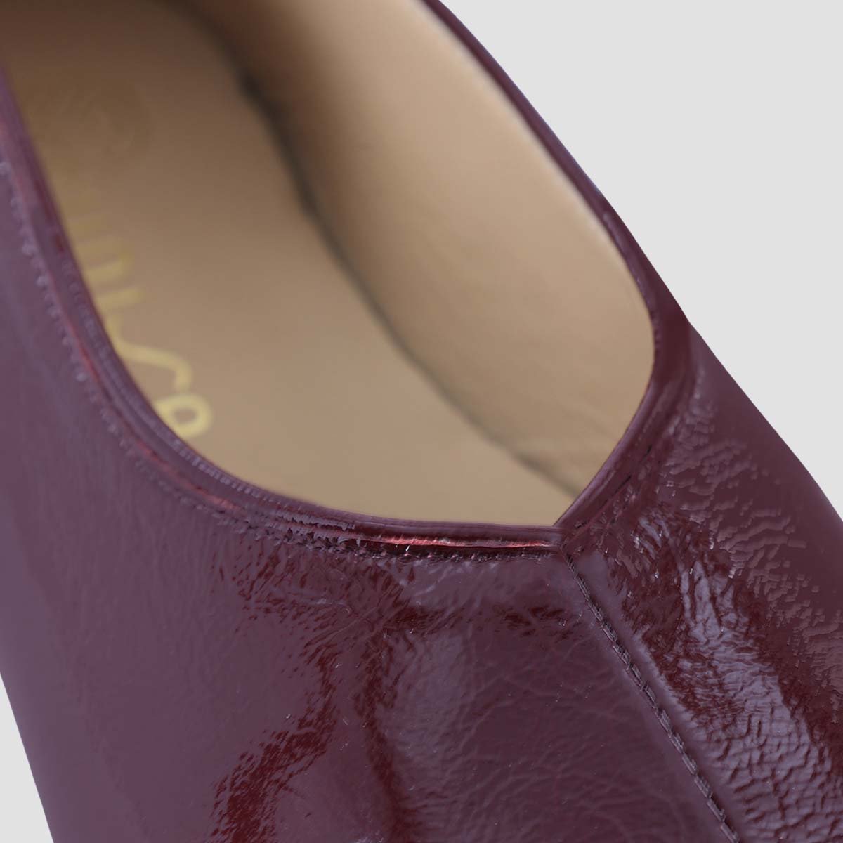 Round toe ballerina shoe made in patent leather. Fancy stitching on the front and soft lining. Light, flexible, non-slip rubber sole. A revamped classic this winter 2025