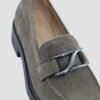Flat round toe loafer made in suede leather. Metal trim over the vamp. Light, flexible, non-slip rubber sole. A classic? Yes, but trendy.