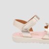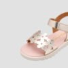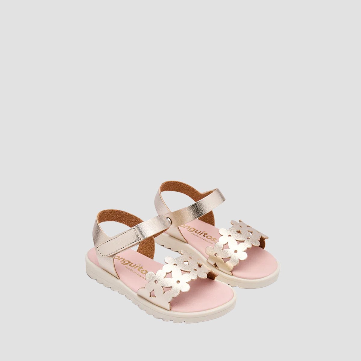 Gold Cut Flower Sandals for girls, made in Spain with a lightweight, durable build for warm-weather wear. The anatomical foot bed and suede insole help provide supportive comfort throughout the day, and the hook-and-loop strap makes them quick to put on and adjust.