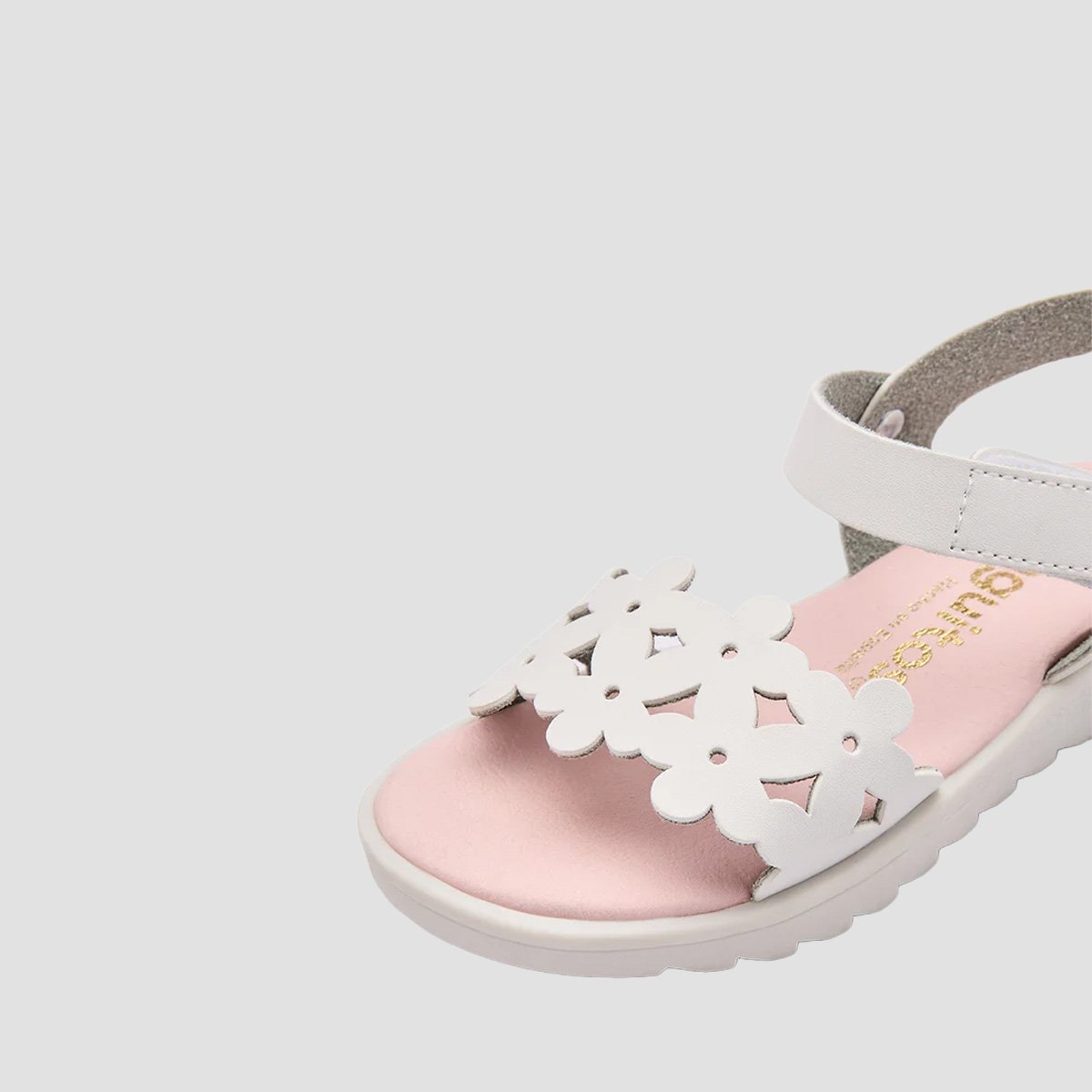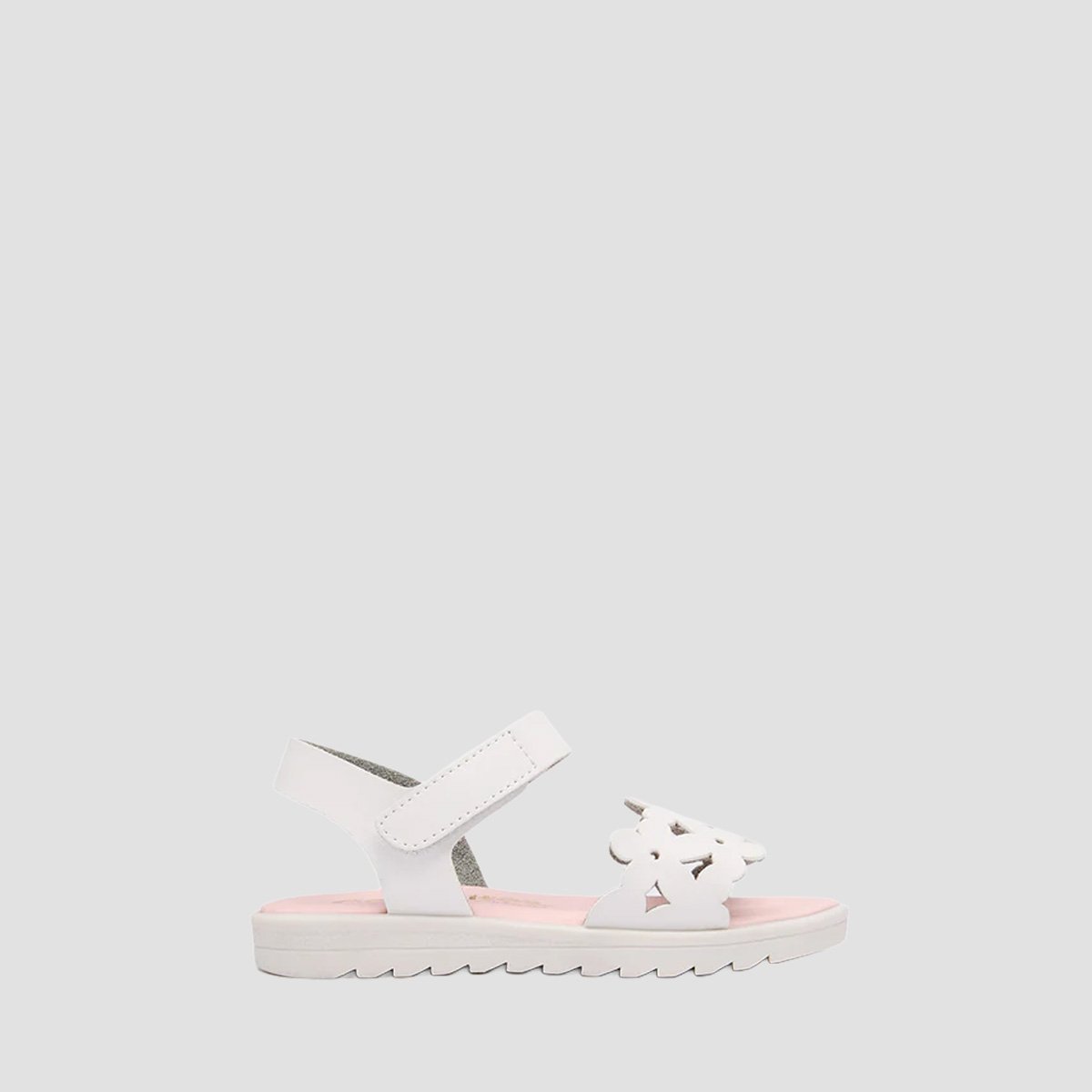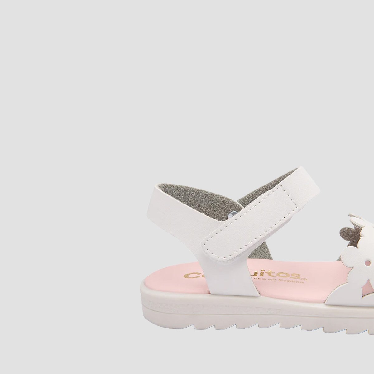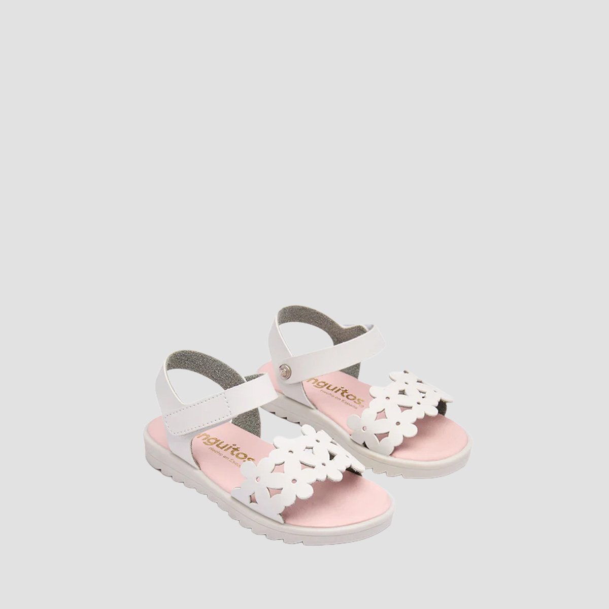 White Cut Flower Sandals for girls, made in Spain with a lightweight, durable build for warm-weather wear. The anatomical foot bed and suede insole help provide supportive comfort throughout the day, and the hook-and-loop strap makes them quick to put on and adjust.