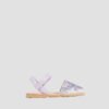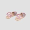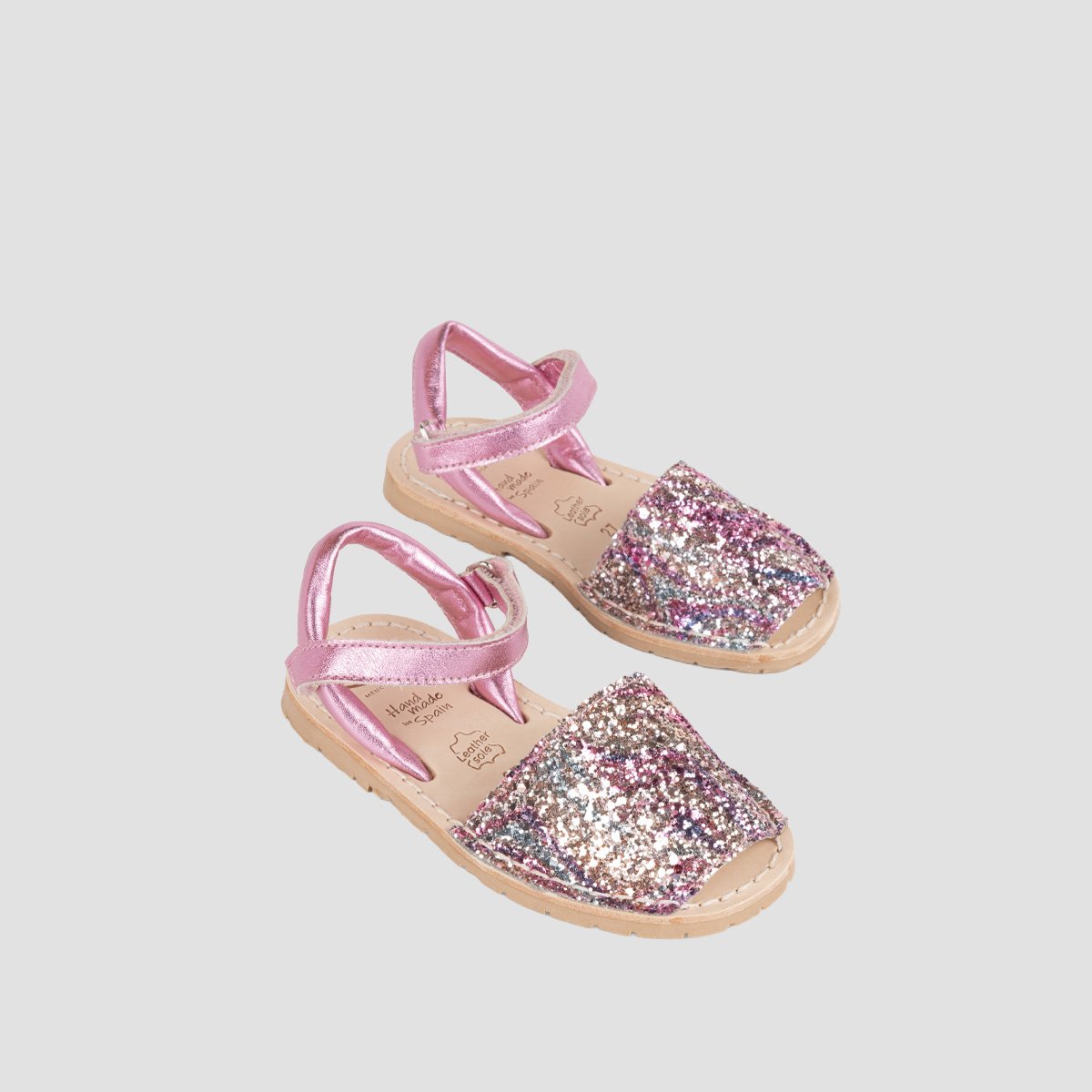 A traditional menorquinas with a fun design twist, young girls will stand out from the crowd in these sparkly sandals. The uppers are covered in multi colors glitter with a plain back strap to match the caramel soles and an extra ankle strap helps to keep little feet snug and secure.