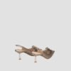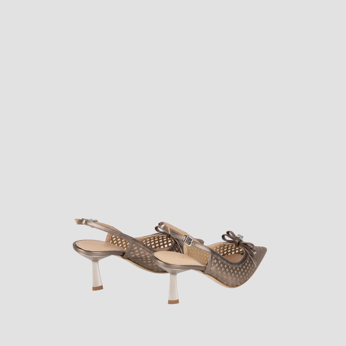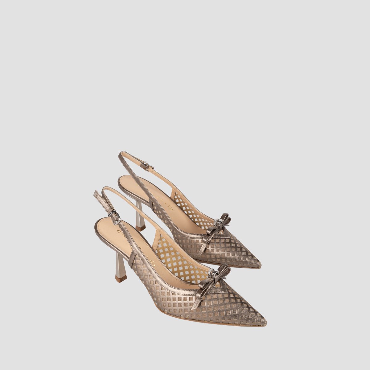 Slingback leather pump with a pointed toe. 8.5 cm high heel covered in leather. Light, flexible and non-slip rubber sole. Metal bow trim in a gold tone. The design of the IBEN model will catch everyone’s eye