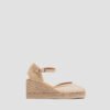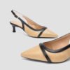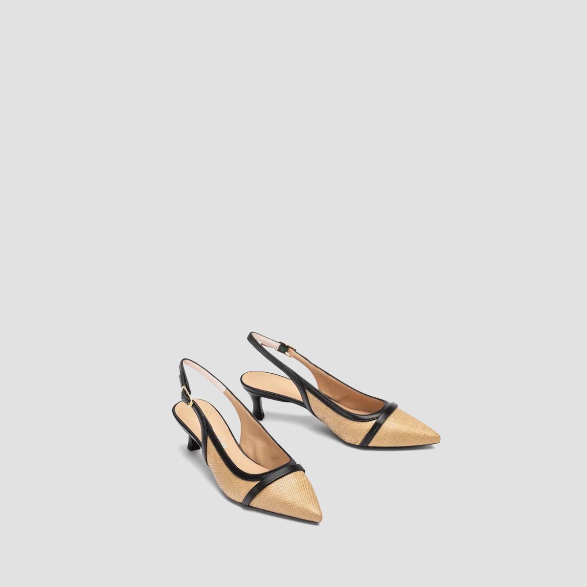 Pointed toe sling back shoe made in contrasting leather and raffia. Thin heel that is 5cm high covered in a matching tone of leather. Light, flexible, non-slip rubber sole. An elegant and practical shoe, ideal for any occasion or special event