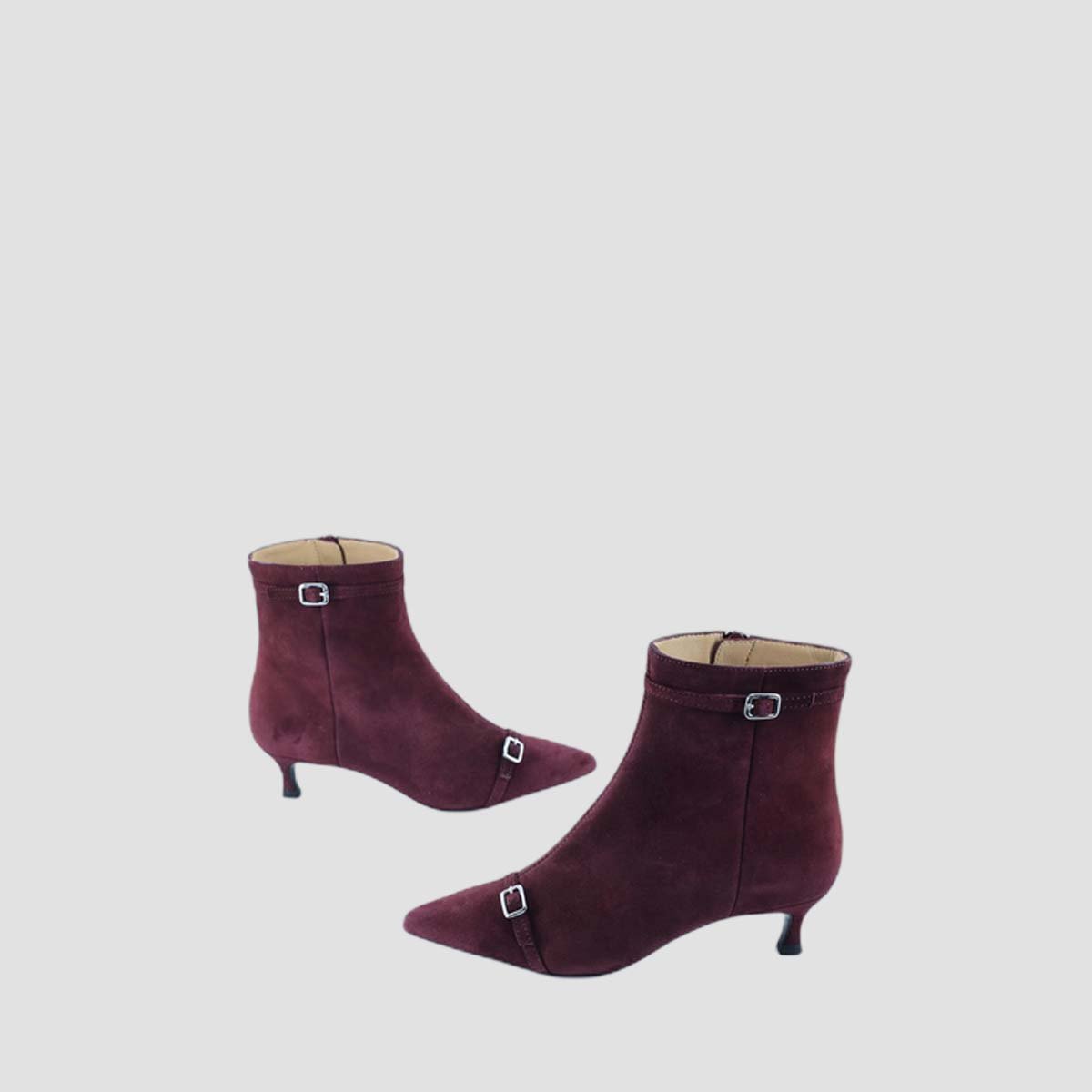 Pointed toe ankle boot made in suede leather. Thin 5cm heel covered in a matching tone. Inner zip and metal buckle trim. Light, flexible, non-slip rubber sole. Perfect ankle boots for any day of the week