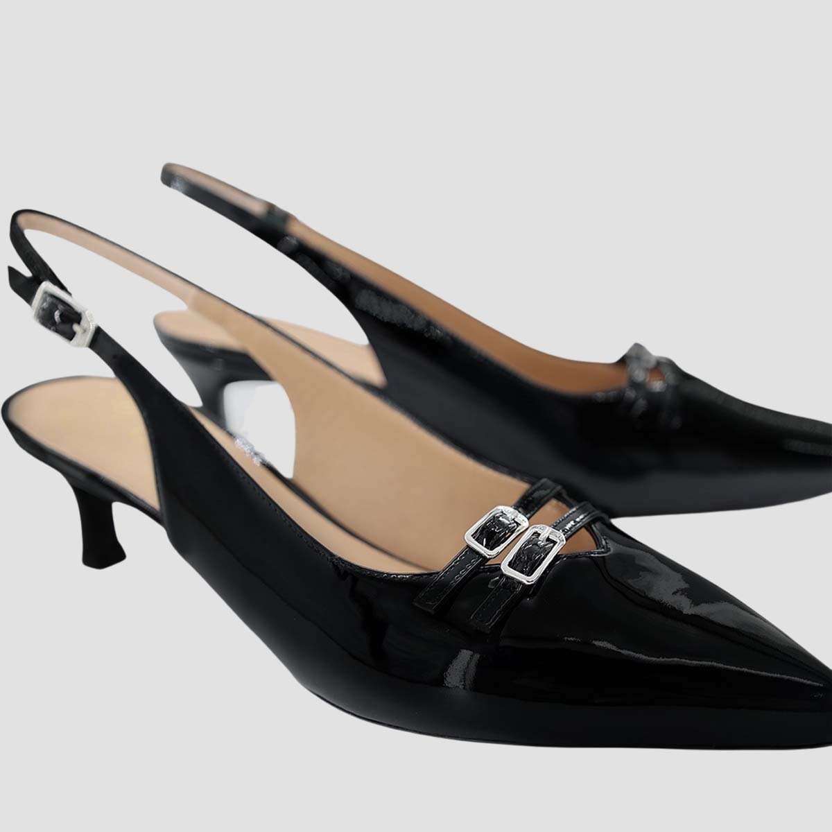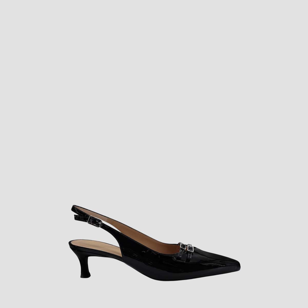 Pointed toe sling back shoe made in leather. Thin 5cm heel covered in a matching tone of leather. Double strap trim with buckles on the vamp. Light, flexible, non-slip rubber sole. With the Unisa IPESU sling back shoe, you will be the center of attention.