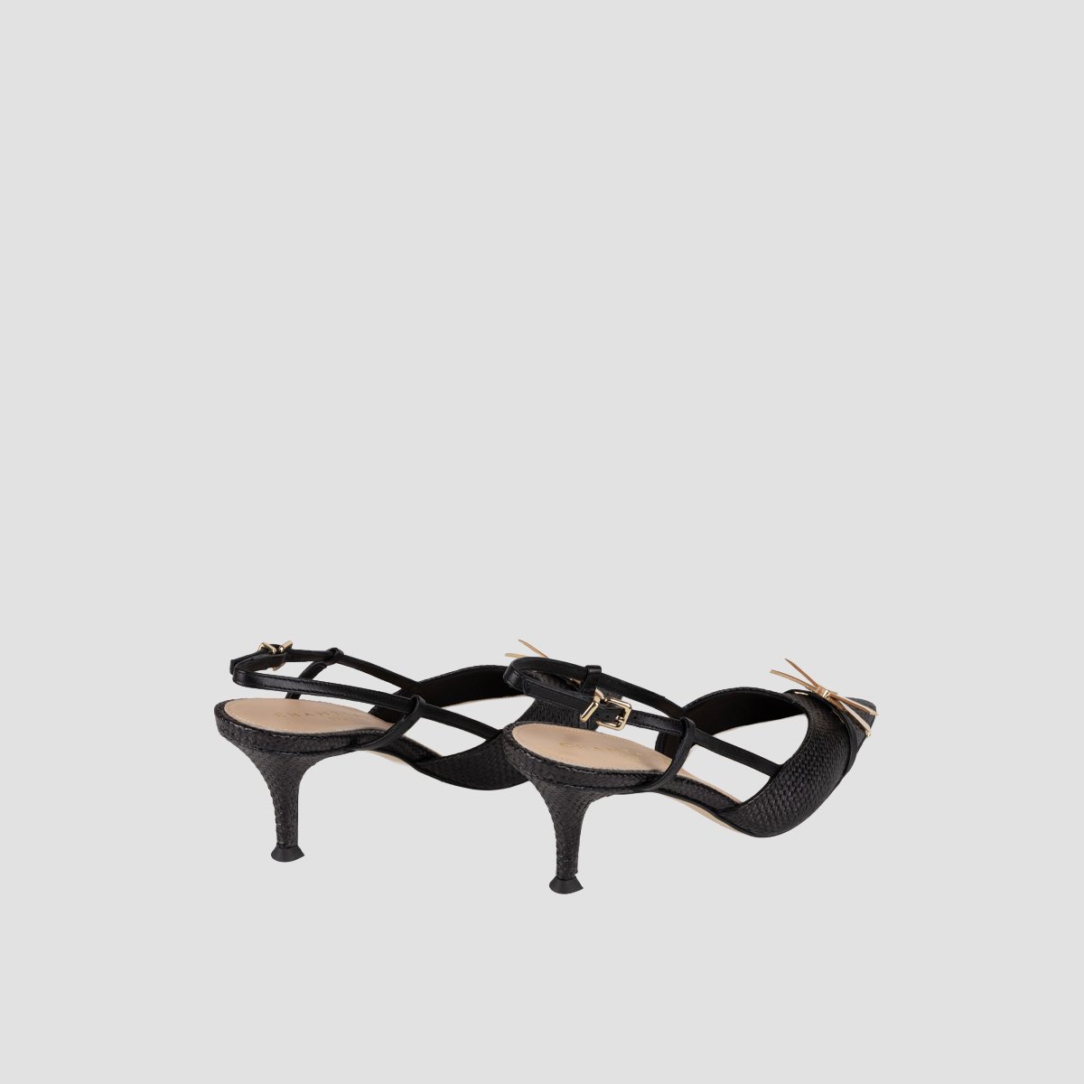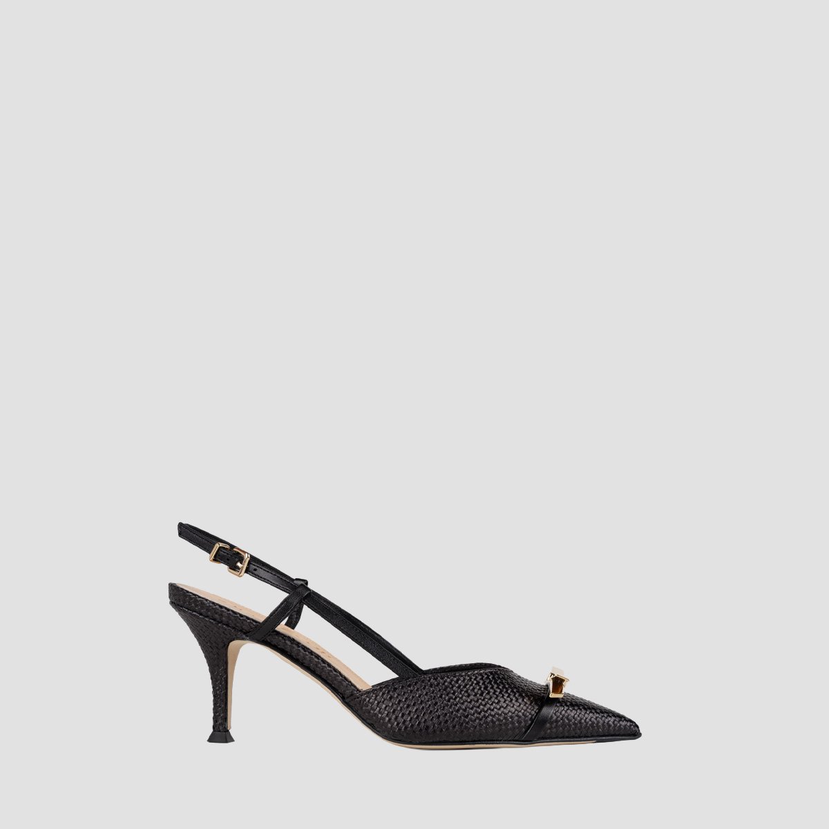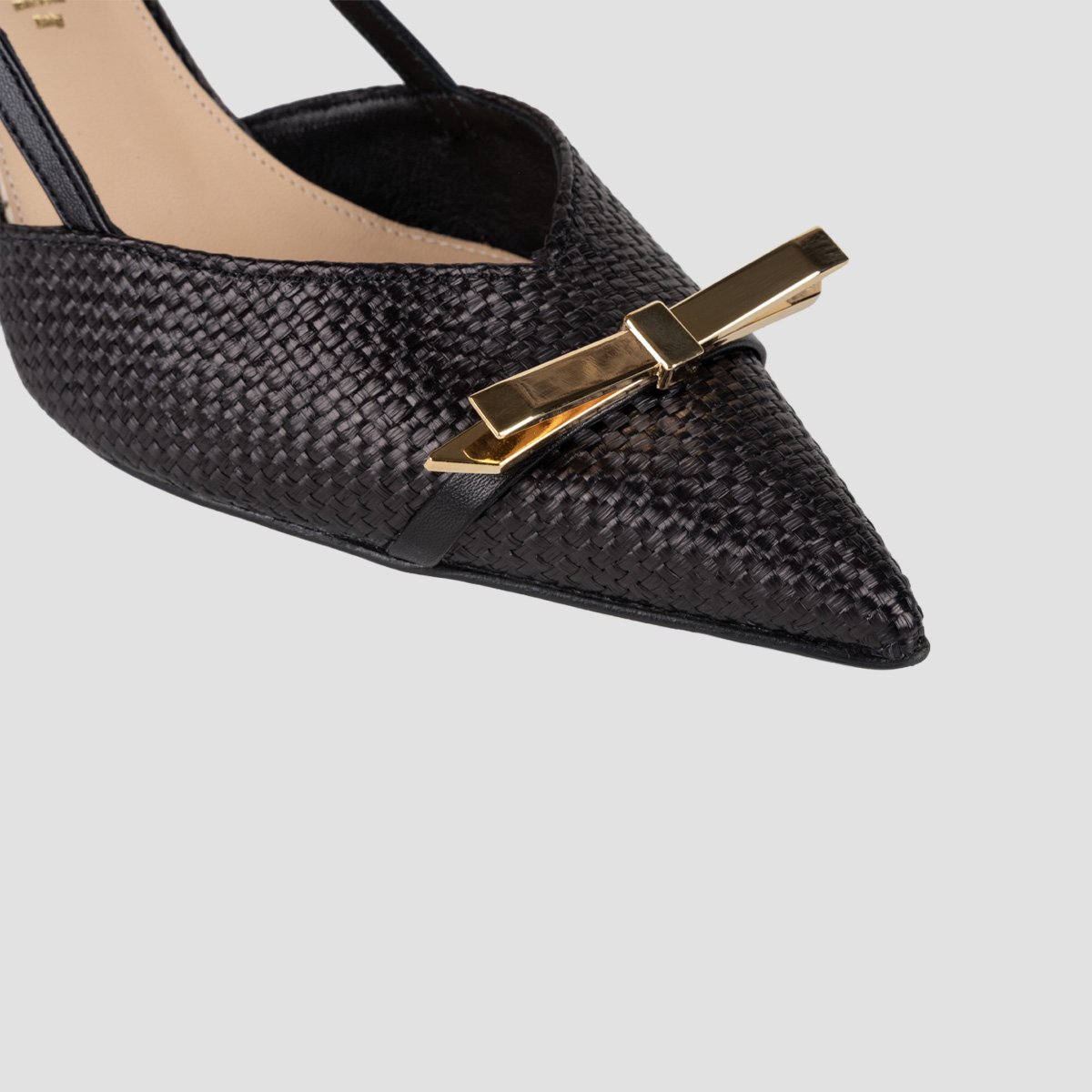 Slingback leather pump with a pointed toe. 8.5 cm high heel covered in leather. Light, flexible and non-slip rubber sole. Metal bow trim in a gold tone. The design of the IVEN model will catch everyone’s eye