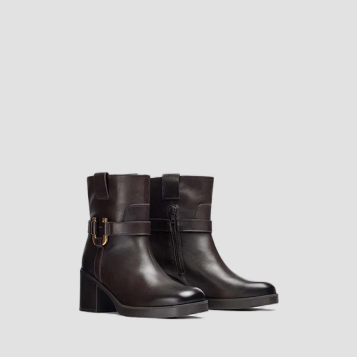 Square toe ankle boot made in made in leather. Inner zip and metal trim on the ankle. Faux wood heel that is 6.5cm high and a 1.5cm platform. Light, flexible, non-slip rubber sole. A classic and versatile design to wear on a daily basis