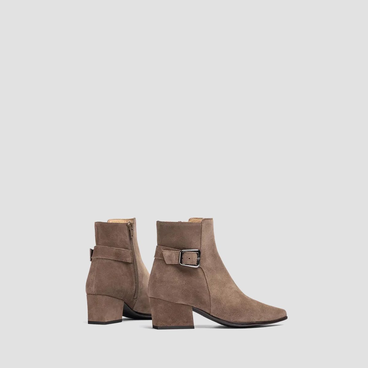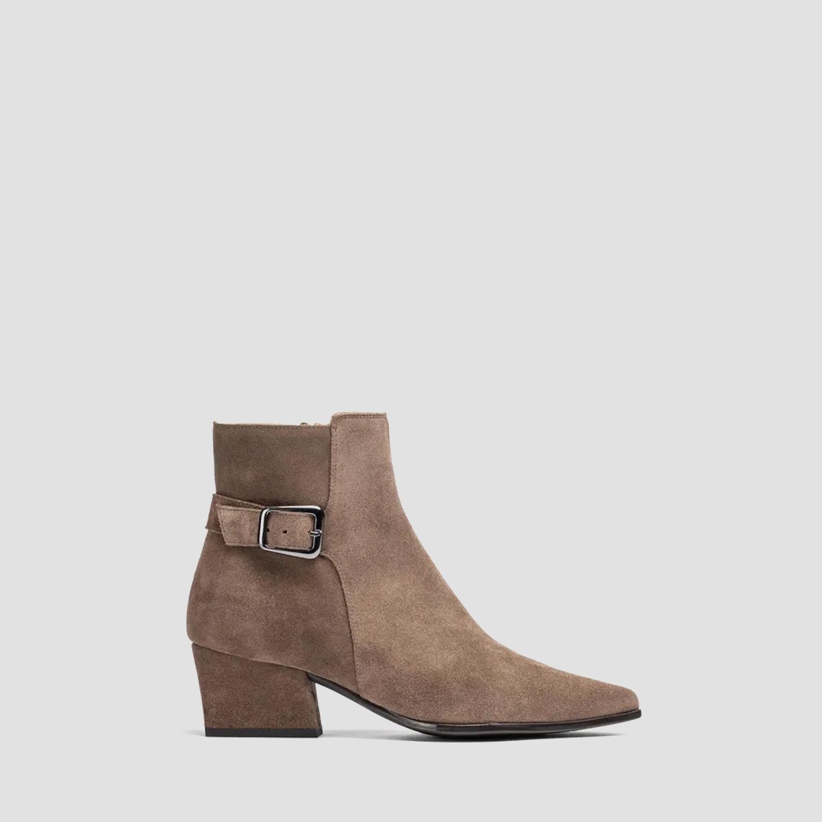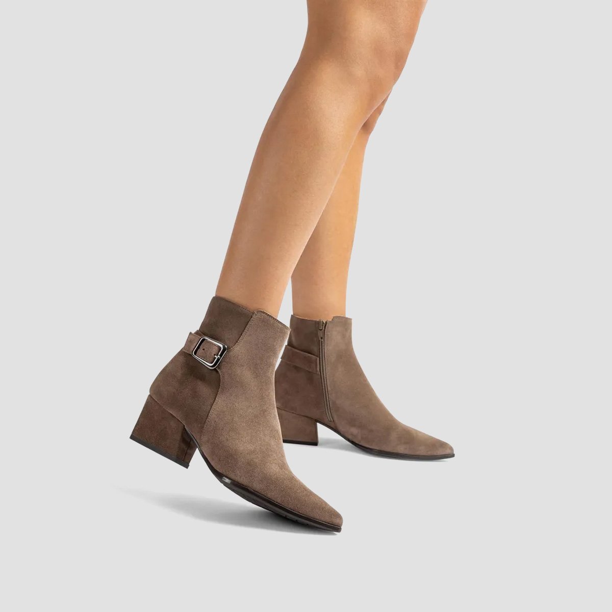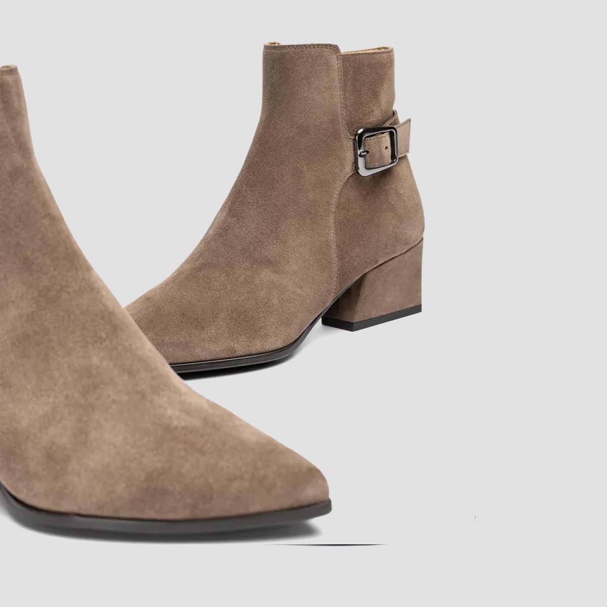 Pointed toe ankle boot made in suede. Inner zip and buckle trim. Comfortable wide heel that is 4.5cm high in a matching tone. Light, flexible, non-slip rubber sole. Give your look a touch of glamour without compromising comfort