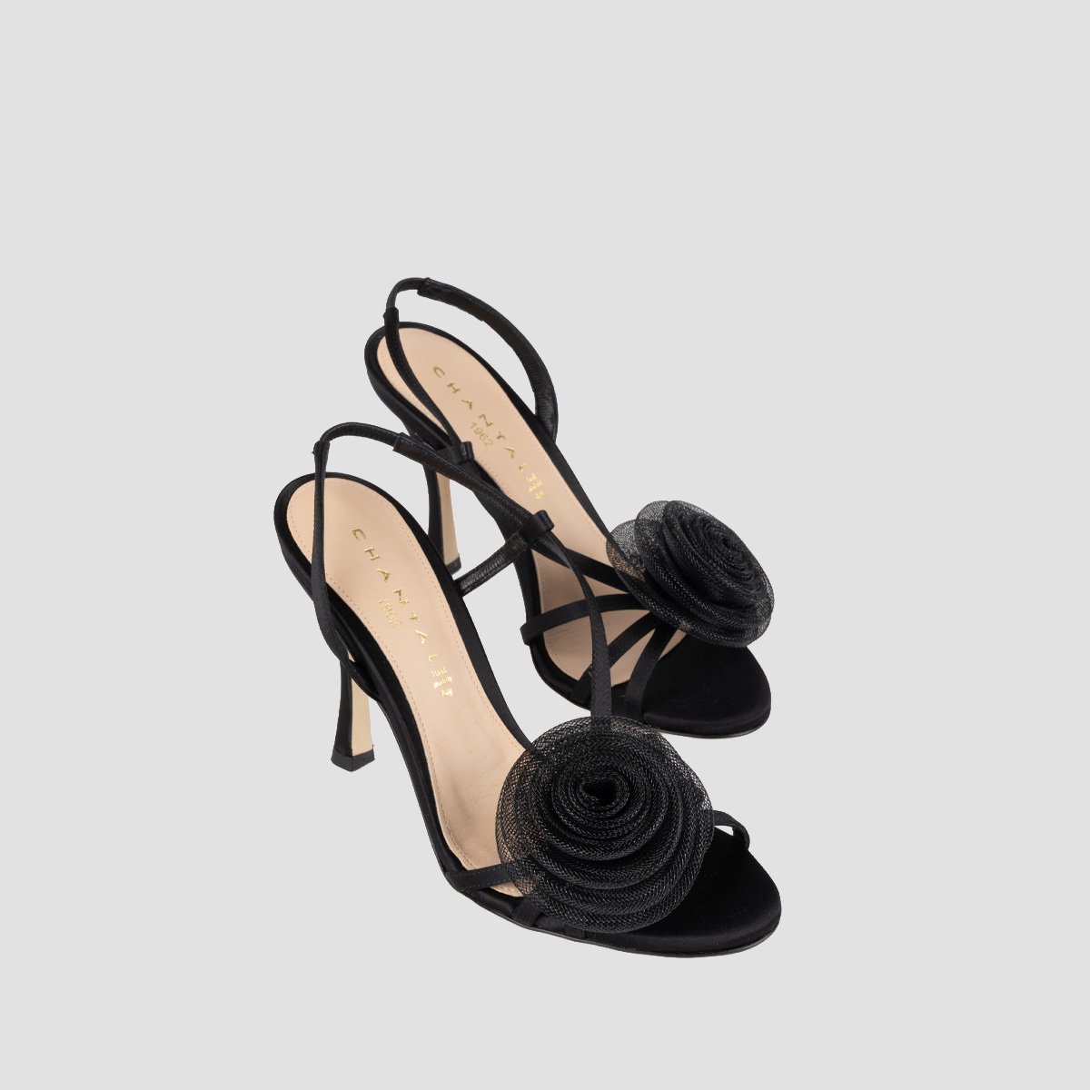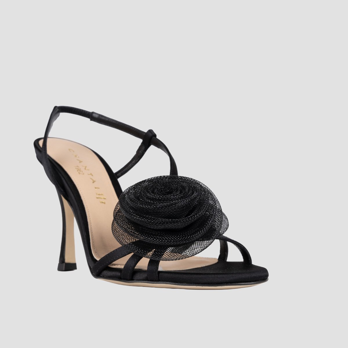Round toe sandal made in satin leather. Thin leather straps in a matching tone with a mesh flower on top to add elegant touch to it .Light, flexible, non-slip rubber sole. A timeless and versatile accessory, ideal to enhance your looks with a feminine touch.