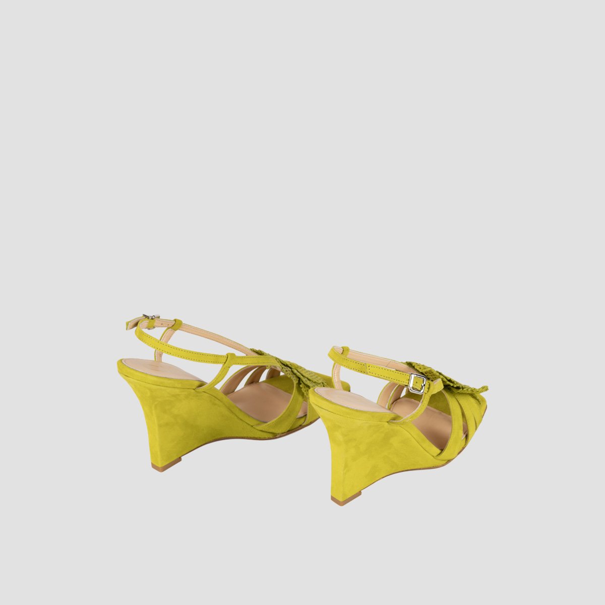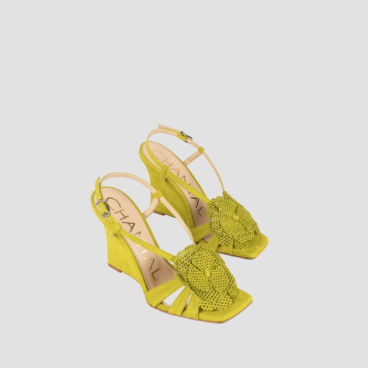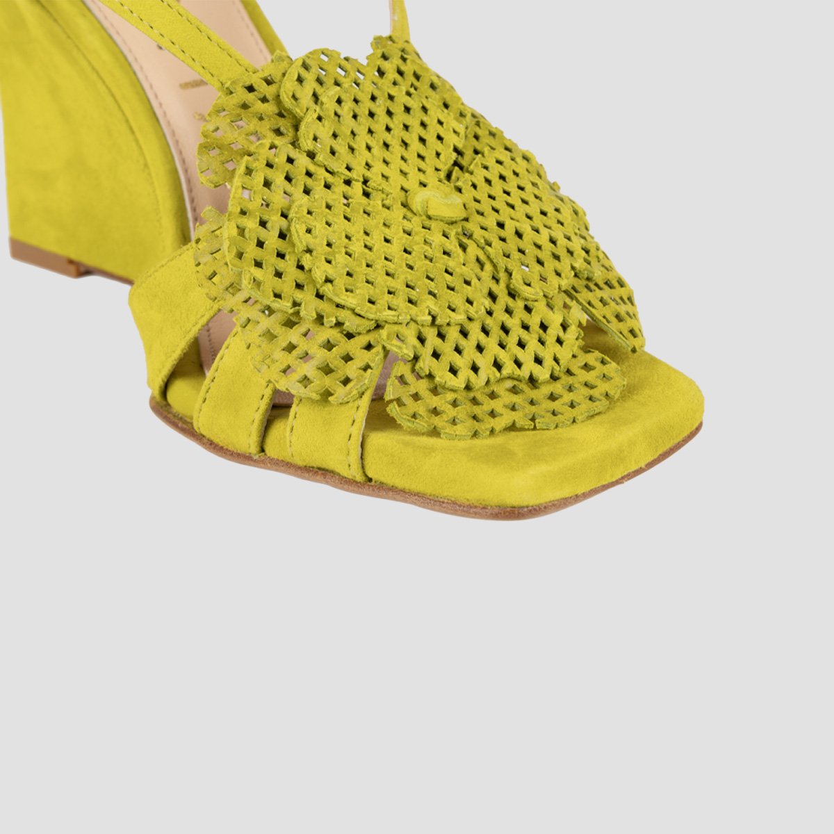 The Kebek wedge sandals is crafted in lime suede leather, defined by a delicate square-toe silhouette and a 10 cm wedge. It is finished with a softly suede leather flower to give it that elegant touch.