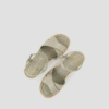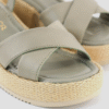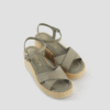 Square toe sandal made in metallic leather. Leather crossover straps and an ankle strap that can be adjusted with the metal buckle. Extra padding in the whole sole for your comfort. 6.5cm high wedge and a 3cm platform covered in natural raffia. Light, non-slip rubber sole. Beautiful and comfortable all day long