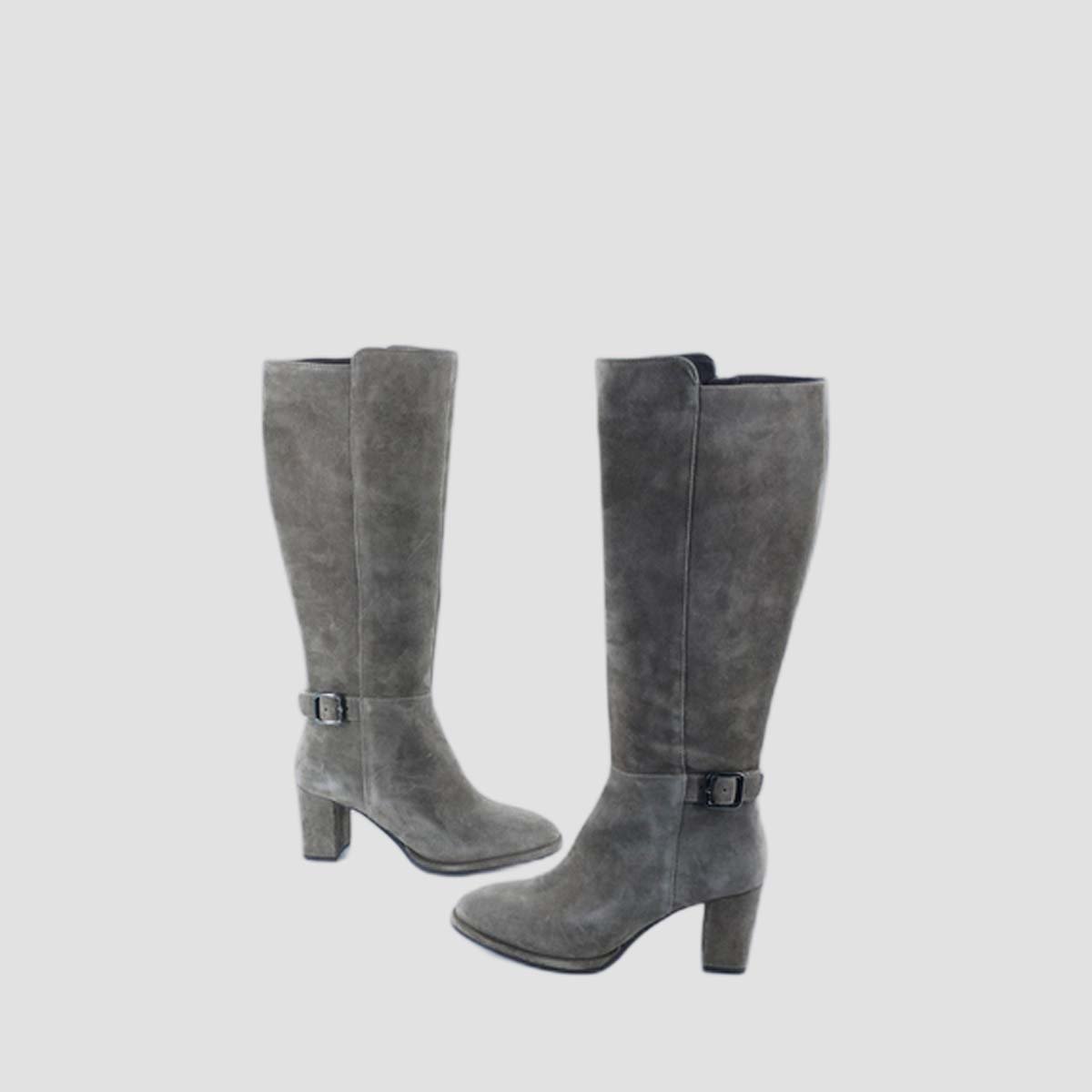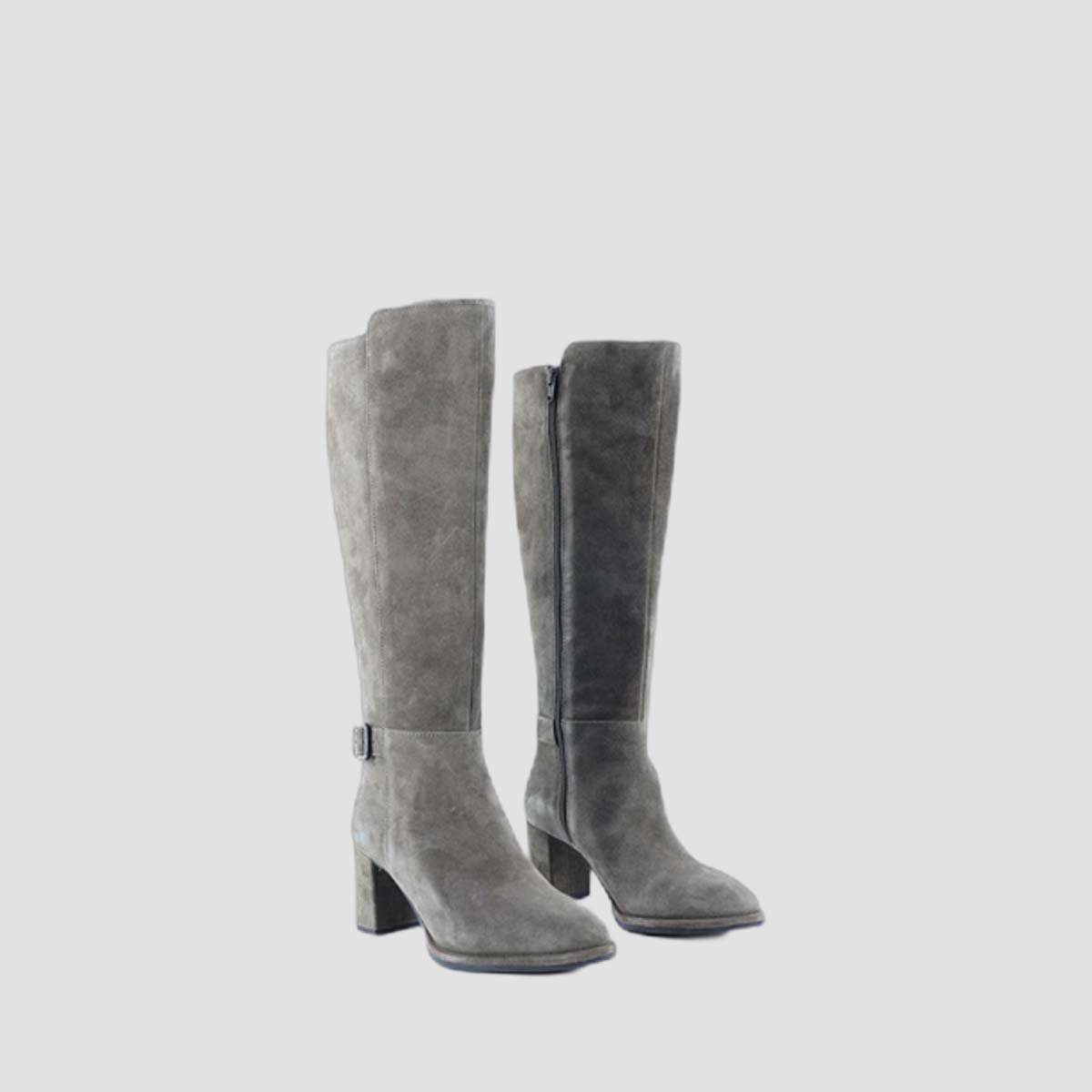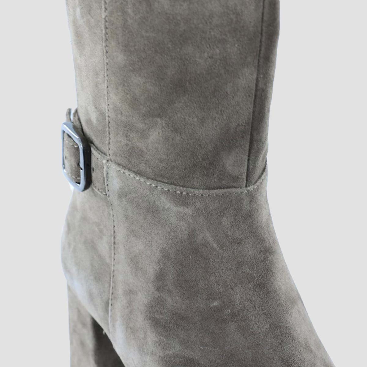 Round toe high shaft boot made in suede. Inner zip and buckle trim on the side. 7cm high heel in a matching tone and a 1cm platform covered in suede. Inner zip. Light, flexible, non-slip rubber sole. An elegant and timeless boot that will go well with all your looks