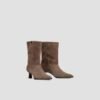 Pointed toe boot made in suede. Painted faux wood slim heel that is 5.5cm high. Convenient button on the outside. Light, flexible, non-slip rubber sole. A perfect and versatile boot to enhance all your looks.