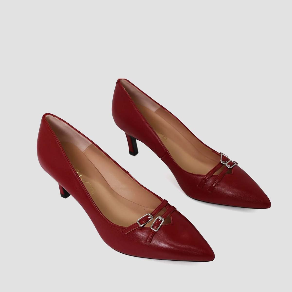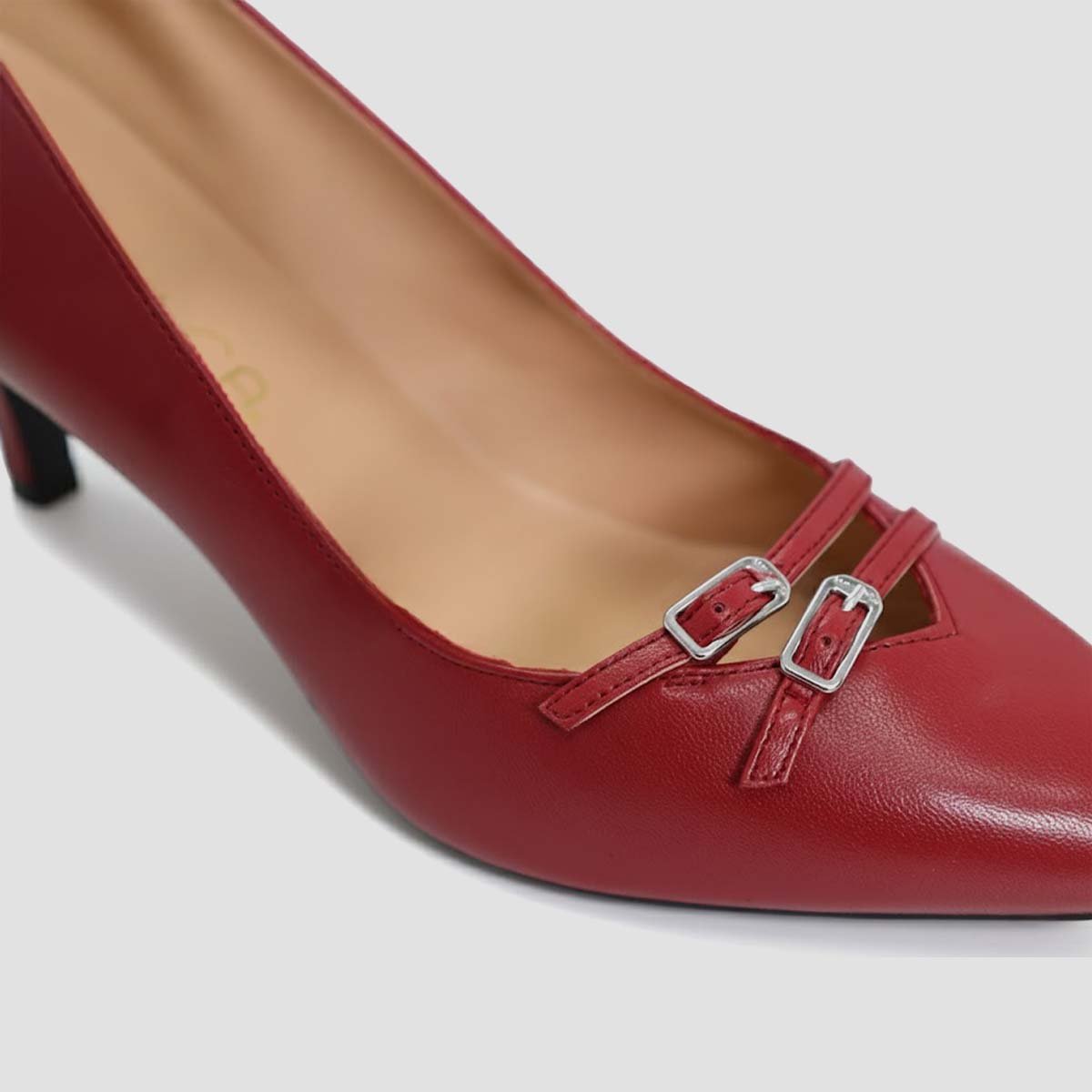 Pointed toe pump made in leather. 7cm high heel in a matching tone. Straps with metal buckle trim on the front. Light, flexible, non-slip rubber sole. Treat yourself to a pair and let nothing get in your way!