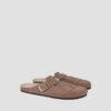 Taupe suede leather clog with fringes and ethnic embellishment. Genuine anatomical foot bed and adjustable buckle. Leather certified by Leather Working Group (LWG) suppliers with Gold status.