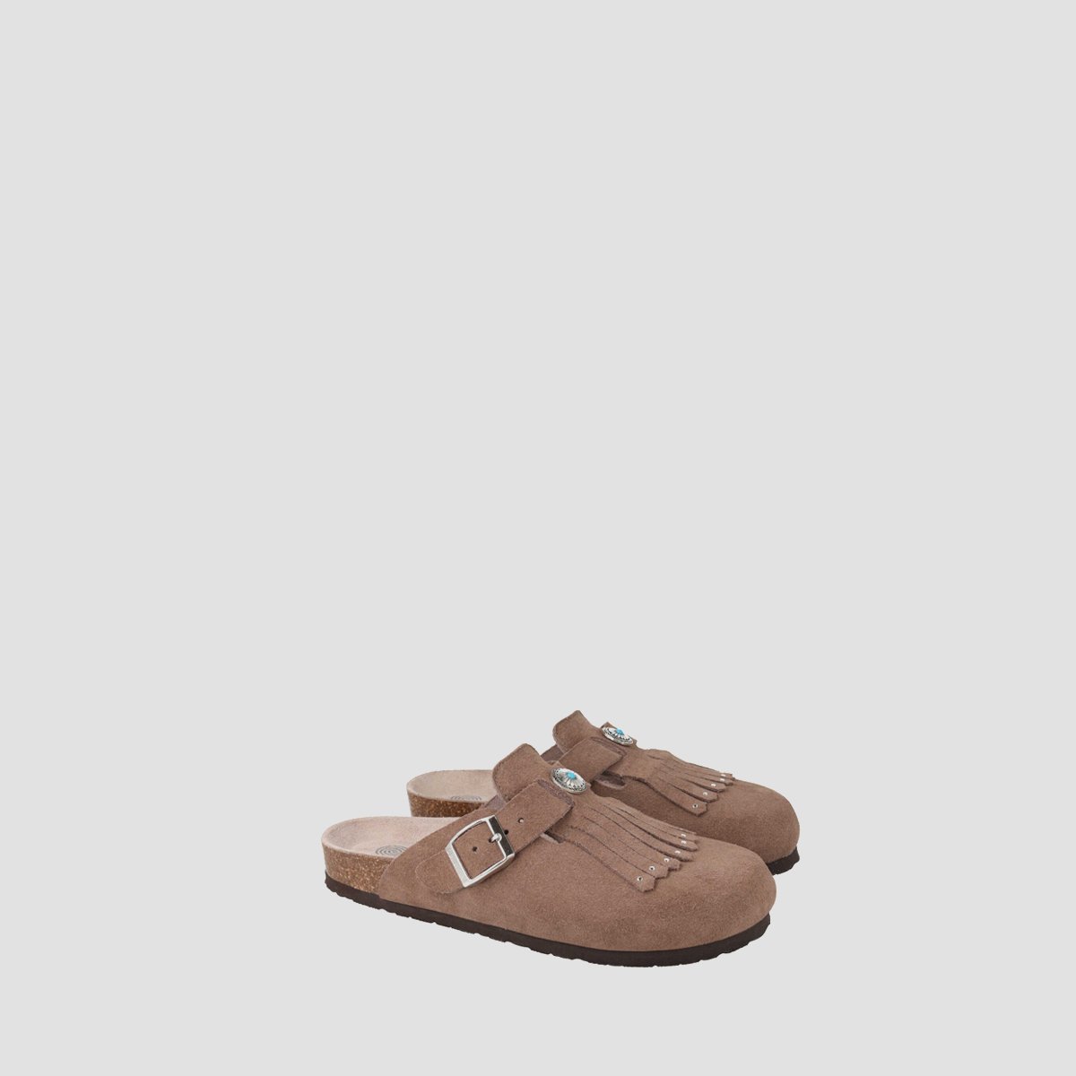 Taupe suede leather clog with fringes and ethnic embellishment. Genuine anatomical foot bed and adjustable buckle. Leather certified by Leather Working Group (LWG) suppliers with Gold status.
