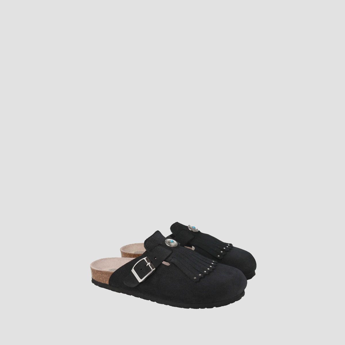 Taupe suede leather clog with fringes and ethnic embellishment. Genuine anatomical foot bed and adjustable buckle. Leather certified by Leather Working Group (LWG) suppliers with Gold status.