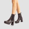 Square toe ankle boot made in leather. Wide heel that is 8cm high and a 2.5cm platform covered in a matching tone of leather. Gusset on the outside in a matching tone and a zip on the inside. Light, flexible and non-slip rubber sole. Beautiful and comfortable all day long