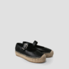 Black leather flat ballet shoe with natural jute sole. Fastens with a buckle on the instep strap. The foot bed is padded with foam, incredibly comfortable!