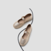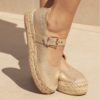 Gold leather flat ballet shoe with natural jute sole. Fastens with a buckle on the instep strap. The foot bed is padded with foam, incredibly comfortable!