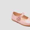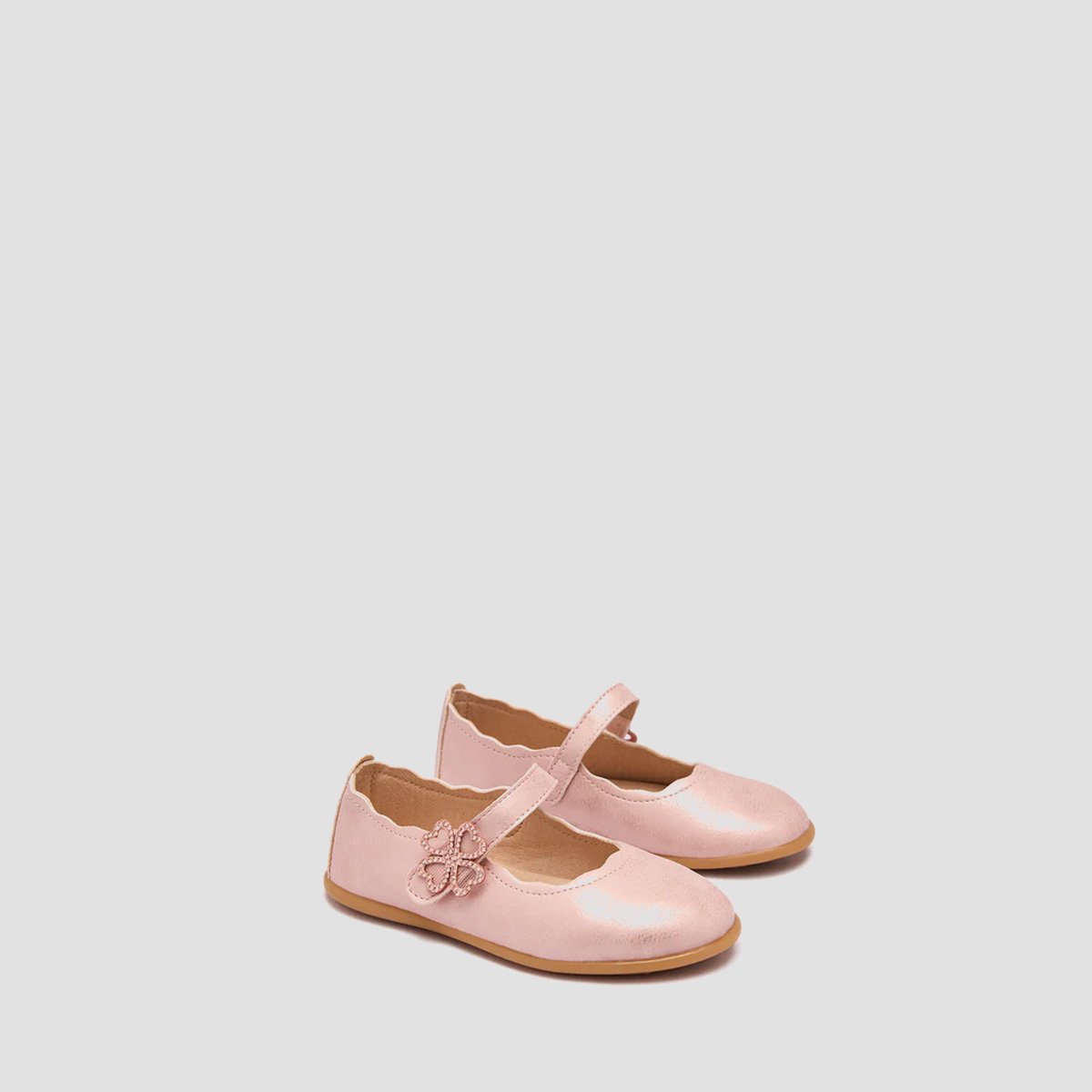 Pink Glitter Hearts Ballerina with a soft shiny finish and a delicate heart detail on the hook-and-loop strap closure, made in Spain for special occasions and everyday comfort.