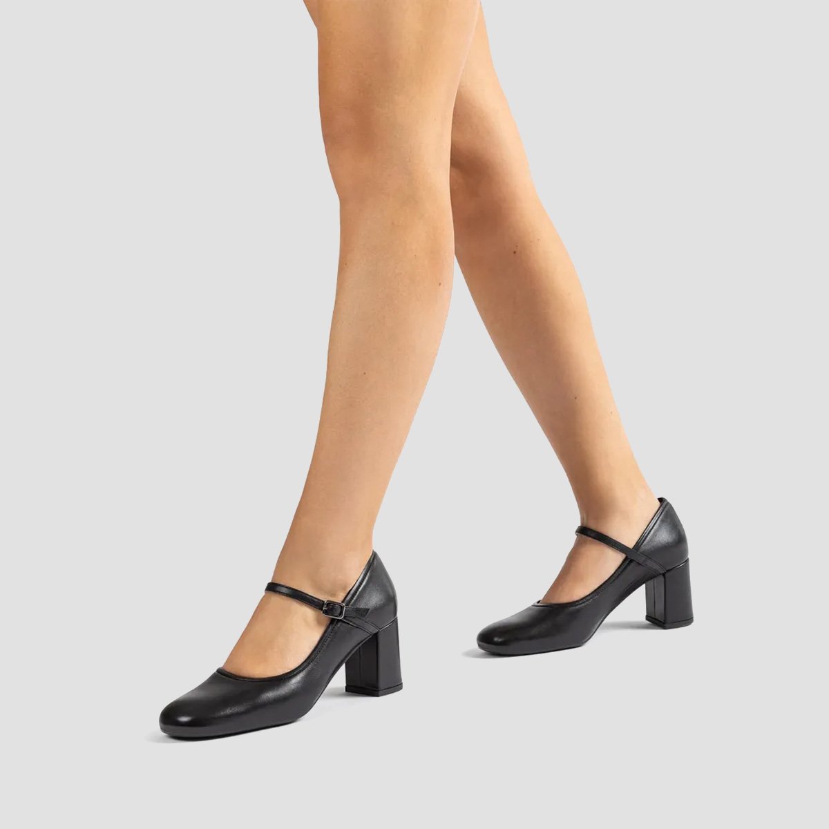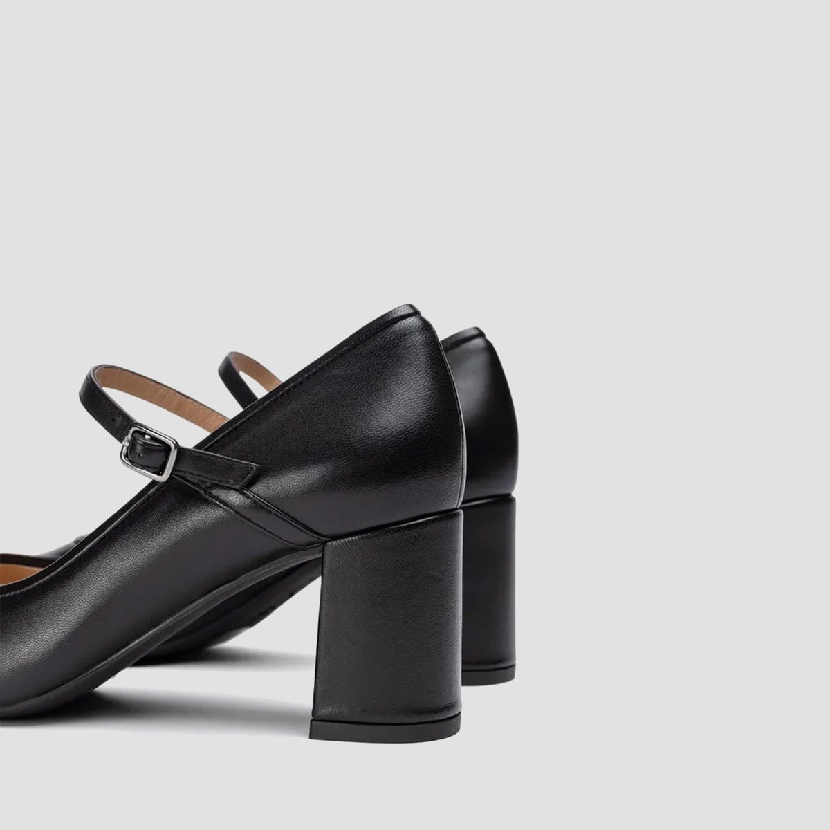 Square toe Mary Jane shoe made in leather. Wide heel that is 6cm covered in leather in a matching tone. Strap over the vamp that can be adjusted with the metal buckle. Light, flexible, non-slip rubber sole. An elegant, timeless and very comfortable design.