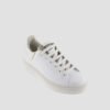 Women’s white faux leather trainers, made in Spain. Gold metallic details on the back and tongue. Neon lace tips with 3 cm tick chunky curved sole.