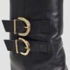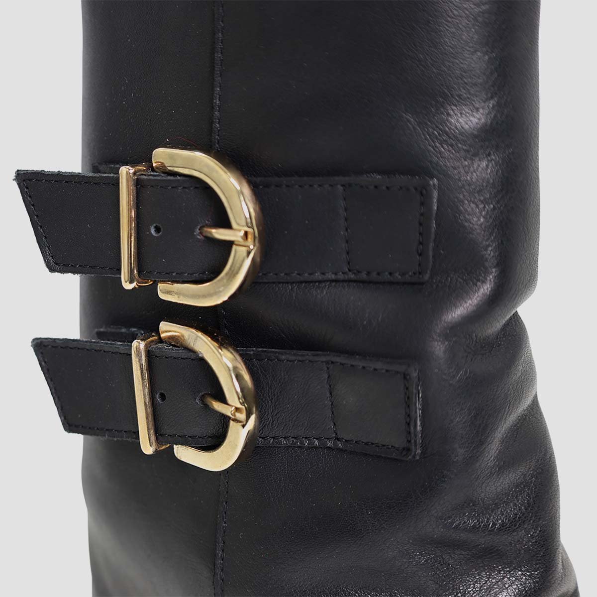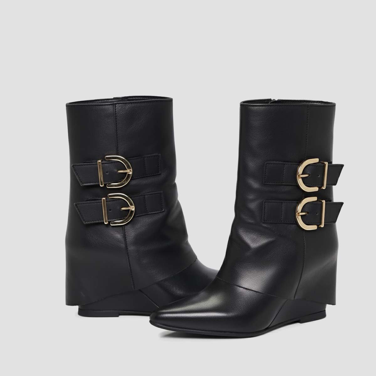 Black leather ankle boots with pointed toe and wedge heels . Short folded shaft with two decorative gold buckles on the side to add elegancy to it.