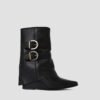 Black leather ankle boots with pointed toe and wedge heels . Short folded shaft with two decorative gold buckles on the side to add elegancy to it.