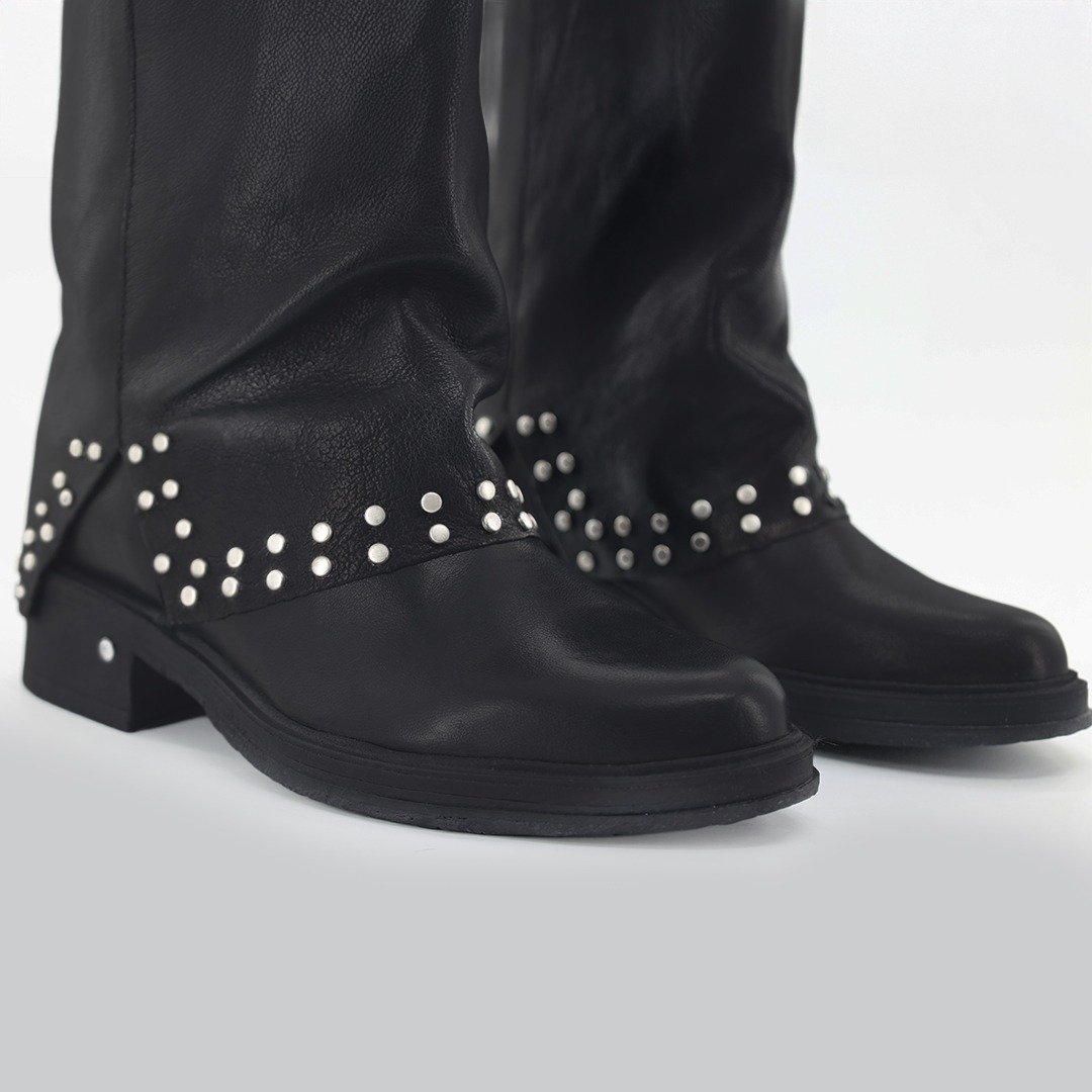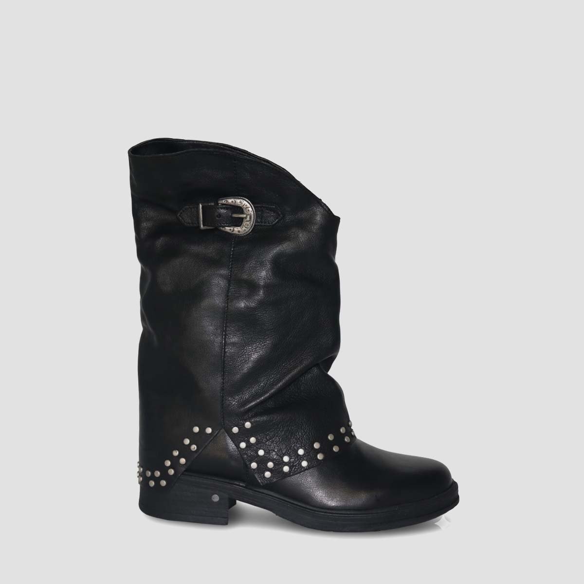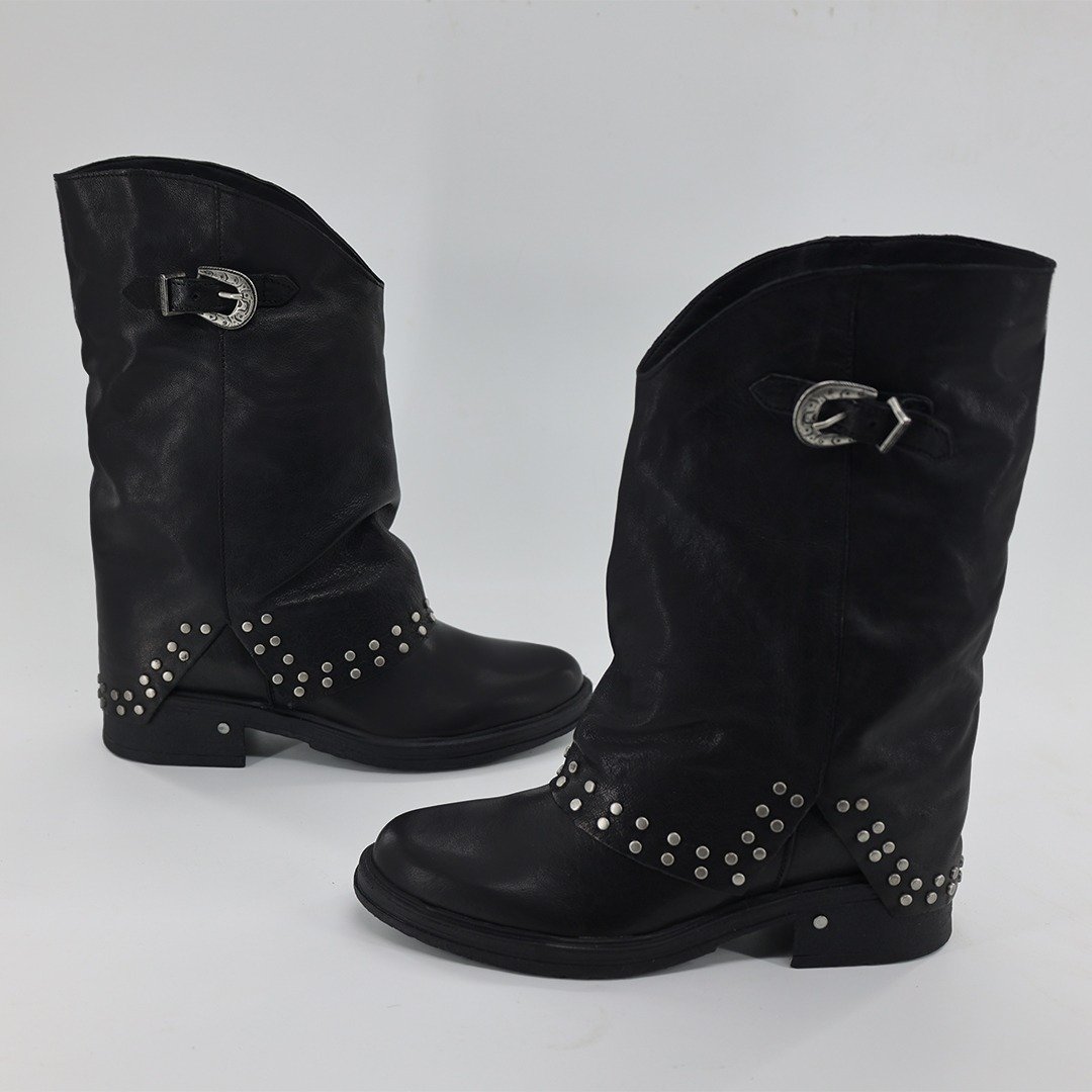 Leather ankle boots with rounded toe. Mid height folded shaft , and low heel .Maximum comfort for those who love stylish boots. This style has become one of the must-have of this season.