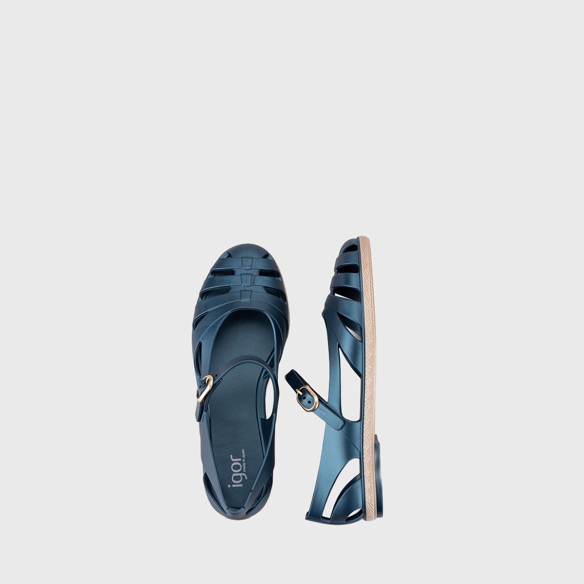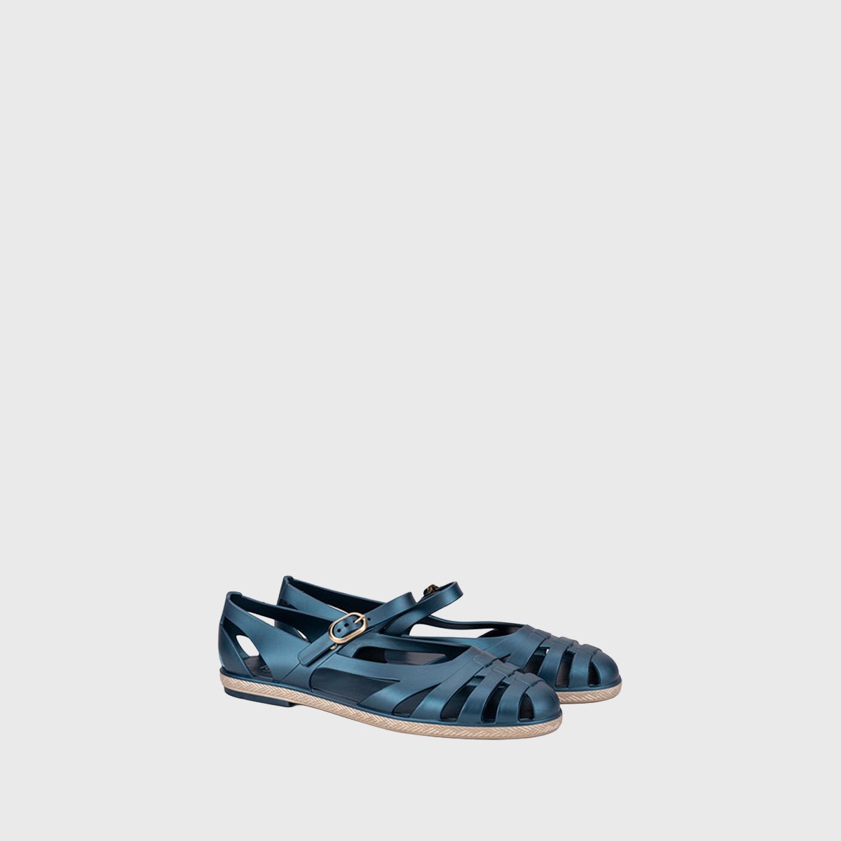 Flat ‘Mary Jane’ style ballerina with simulated jute detail on the sole, matt finish and buckle closure. Sandals with a special design, you cannot miss them!
