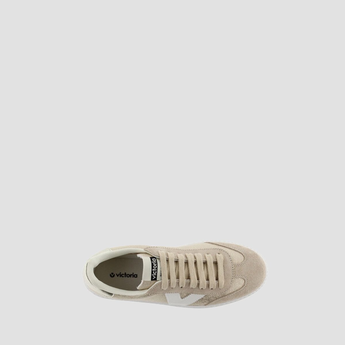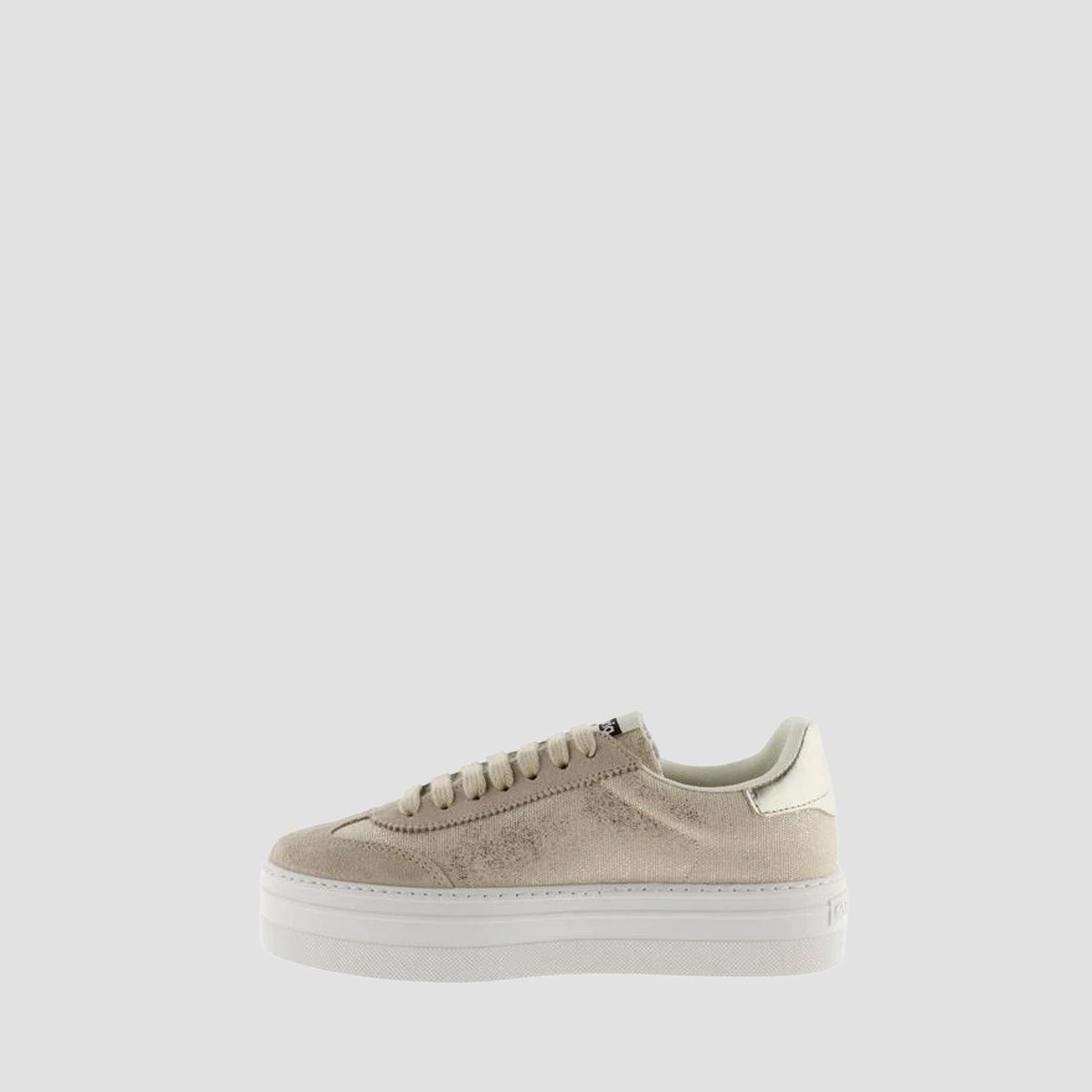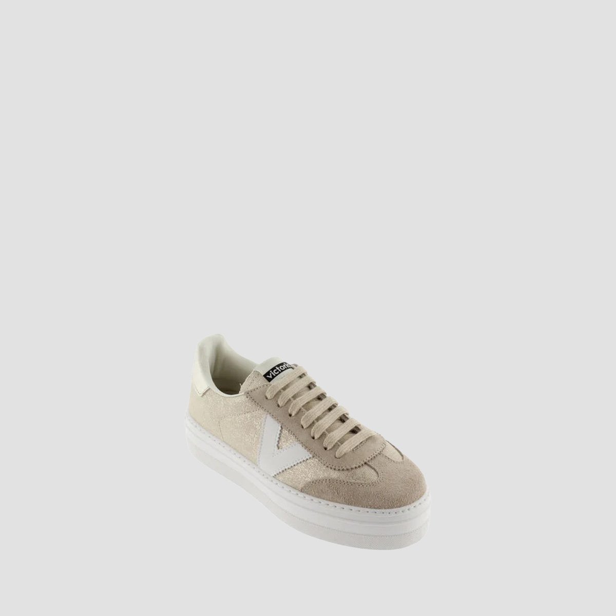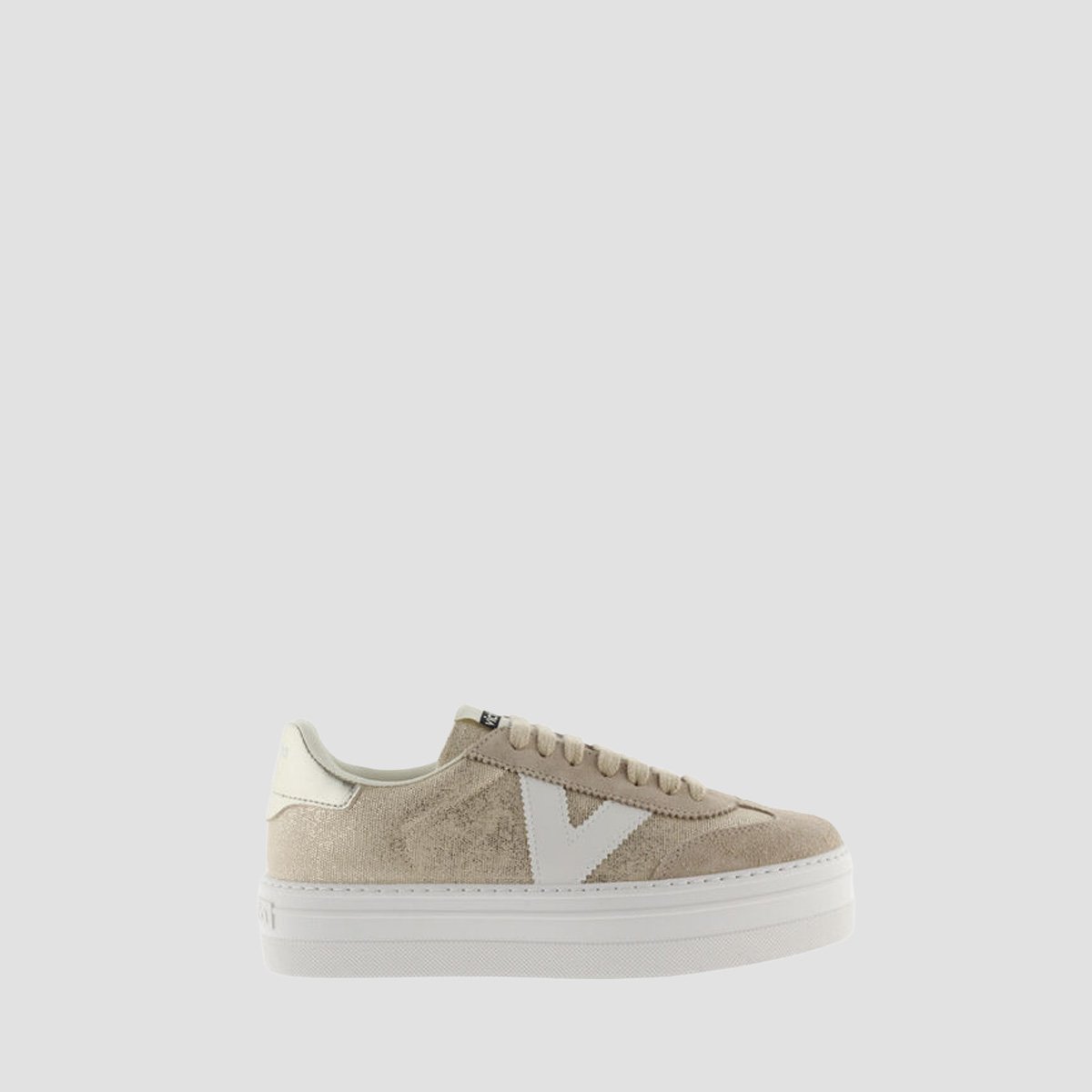 Platform trainers for women. Made in Spain from metallic canvas with matching suede details. Contrasting white side victoria “V” and metallic back panel. Matching lace-up fastening. Comfortable 4 cm white PVC sole made with vegetable oils instead of minerals, helping to reduce environmental impact.