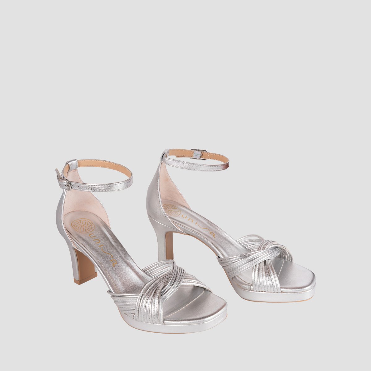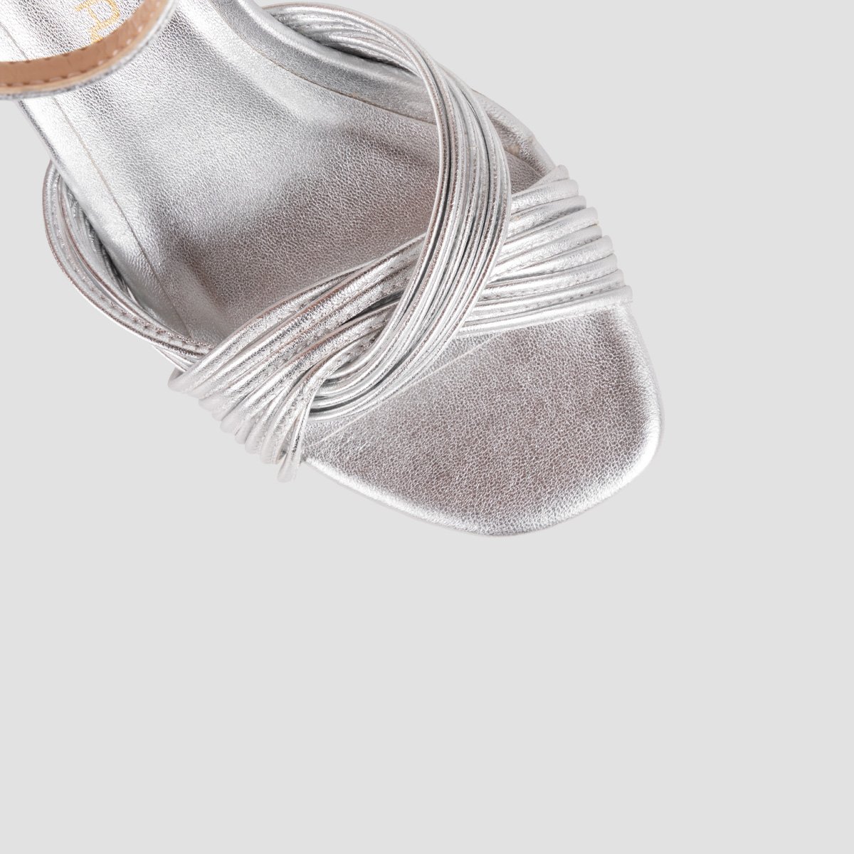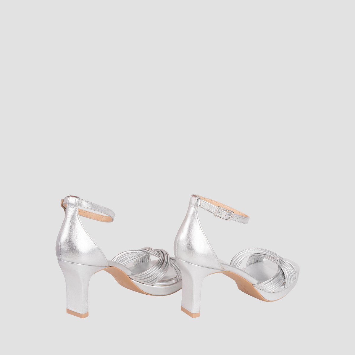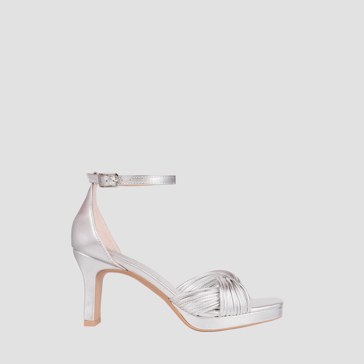 Square toe sandal made in metallic leather. Numerous straps on the front and an ankle strap that can be adjusted using the metal buckle. Platform that is 1.5cm high and an 8cm heel in a matching tone. Non-slip rubber sole