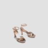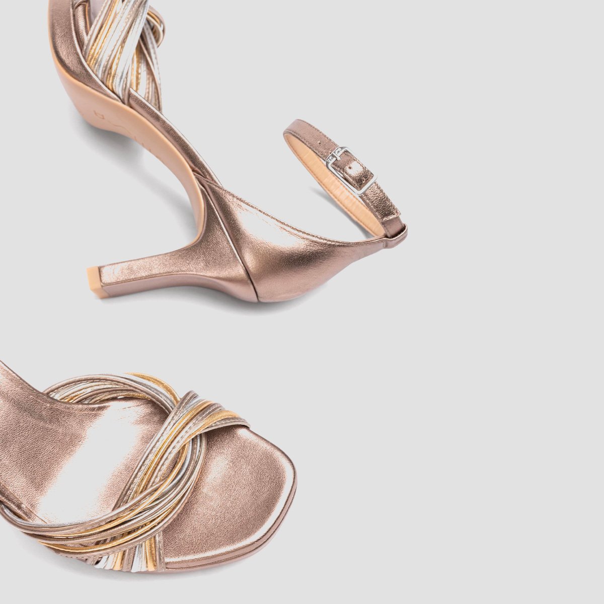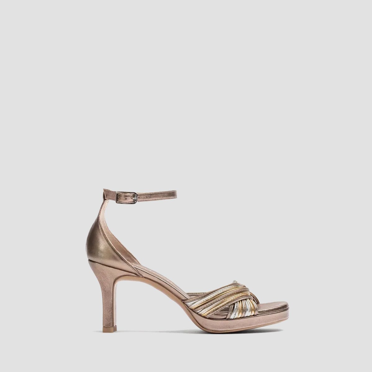 Square toe sandal made in metallic leather. Numerous straps on the front and an ankle strap that can be adjusted using the metal buckle. Platform that is 1.5cm high and an 8cm heel in a matching tone. Non-slip rubber sole