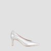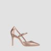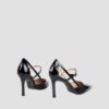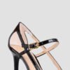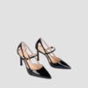 Pointed toe pump made in patent leather. Open sides and metal buckle trim. Thin heel that is 9.5 cm high covered in a matching tone of patent leather. Light, flexible, non-slip rubber sole