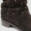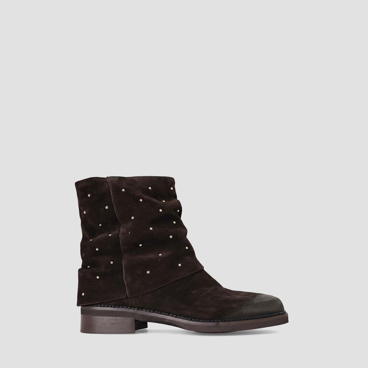 Suede leather ankle boots with rounded toe. Short folded shaft with decorative small studs and low heel .Maximum comfort for those who love stylish boots.