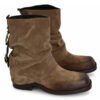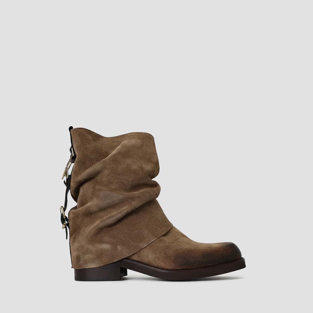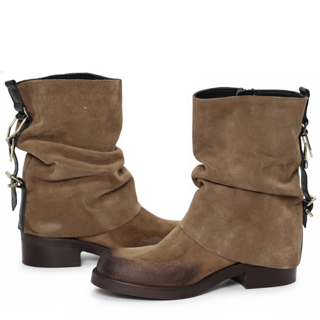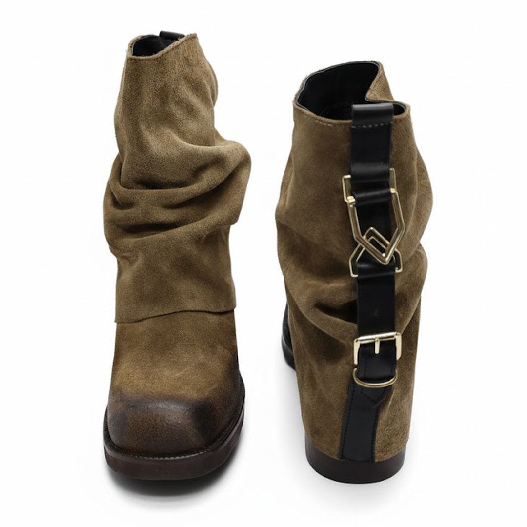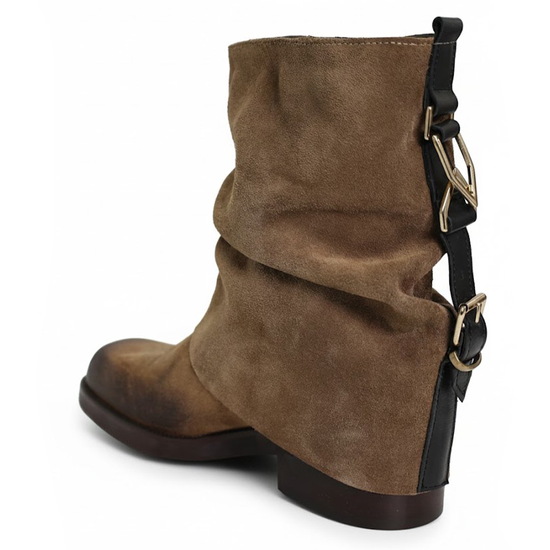 Suede leather ankle boots with squared toe . Short folded shaft with decorative buckles on the back to add style to it.